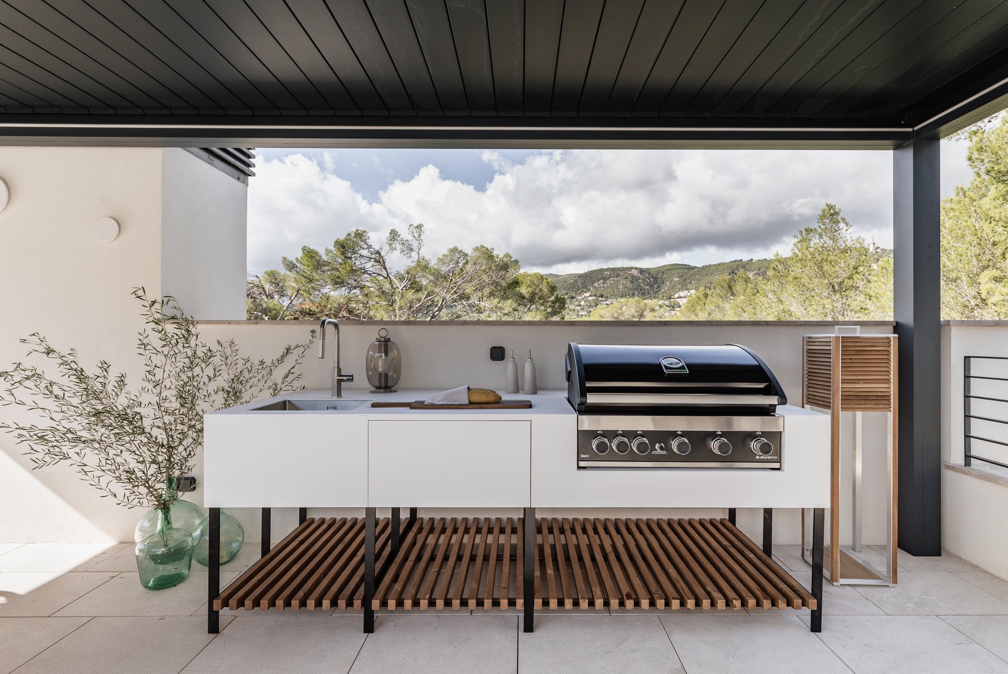 Utomhus väntar en privat pool, en generös terrass och ett fullt utrustat utekök, kompletterat med en praktisk dusch, perfekta ytor för avkoppling och sociala stunder i solen.