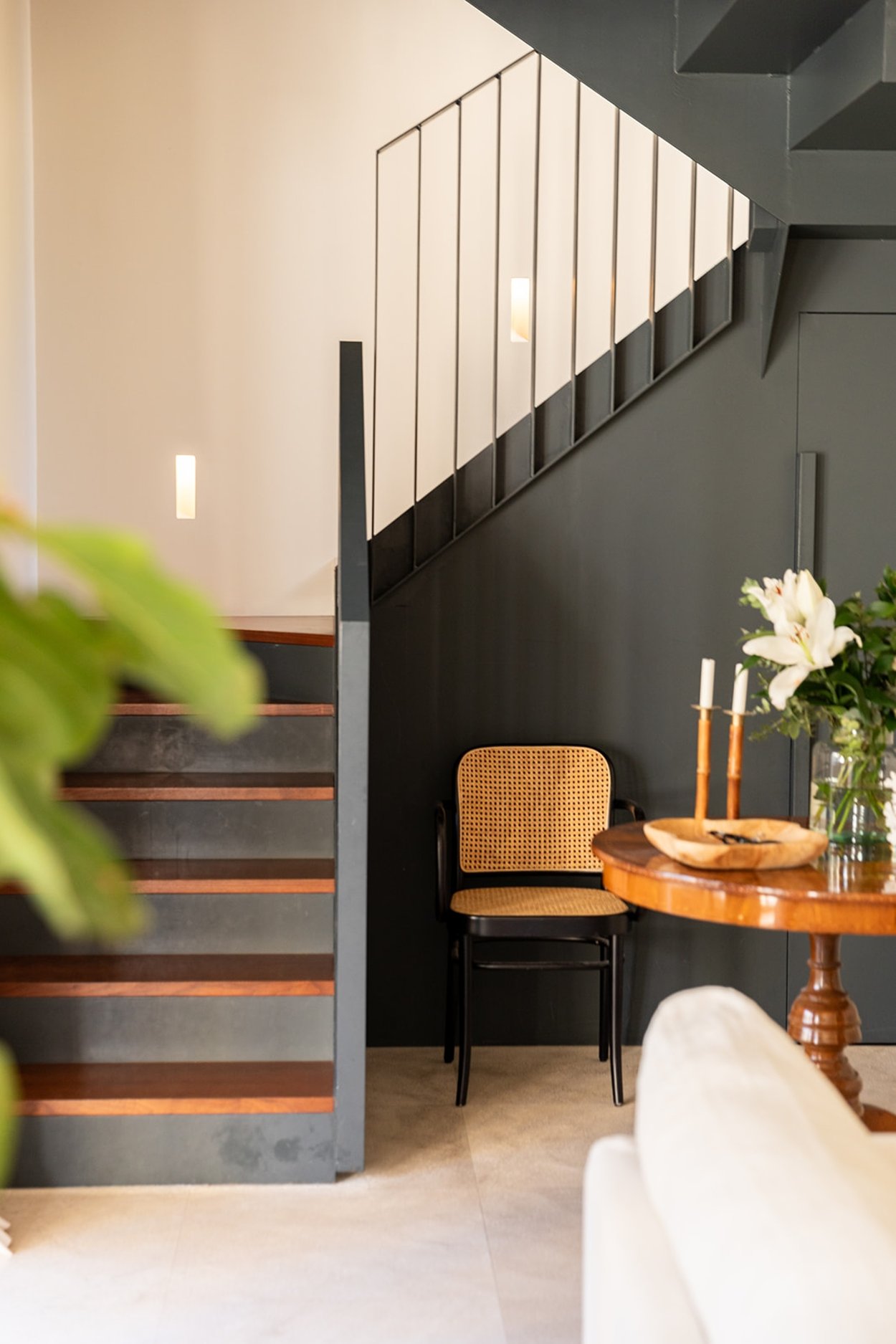 En svart, industriell trappa tar dig upp till övre plan där du hittar det exklusiva köket i öppen planlösning med ytterligare ett vardagsrum, två sovrum – varav det ena med en-suite badrum – samt en mysig terrass med vacker utsikt. Stora fönsterpartier längs terrassen släpper in rikligt med naturligt ljus och skapar en luftig och öppen känsla i hela bostaden.