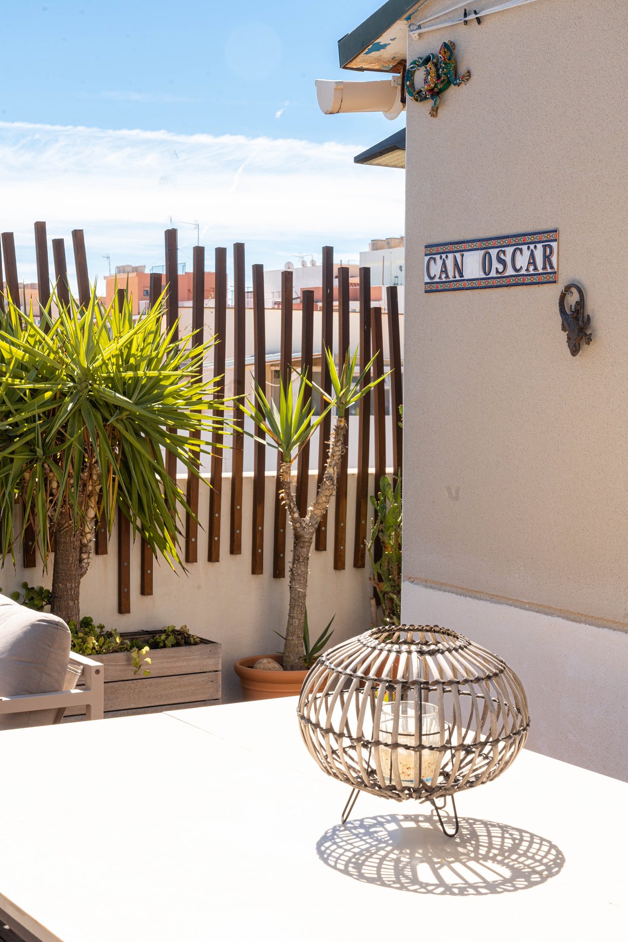 På övervåningen finns två rymliga sovrum, varav det ena med walk-in-closet, samt två badrum, ett en-suite med dusch och ett med badkar. Här finns även en praktisk tvättstuga. En trappa upp når du den privata terrassen om 36 m², med gott om plats för loungegrupp, stort matbord, solstolar, dusch och grill.