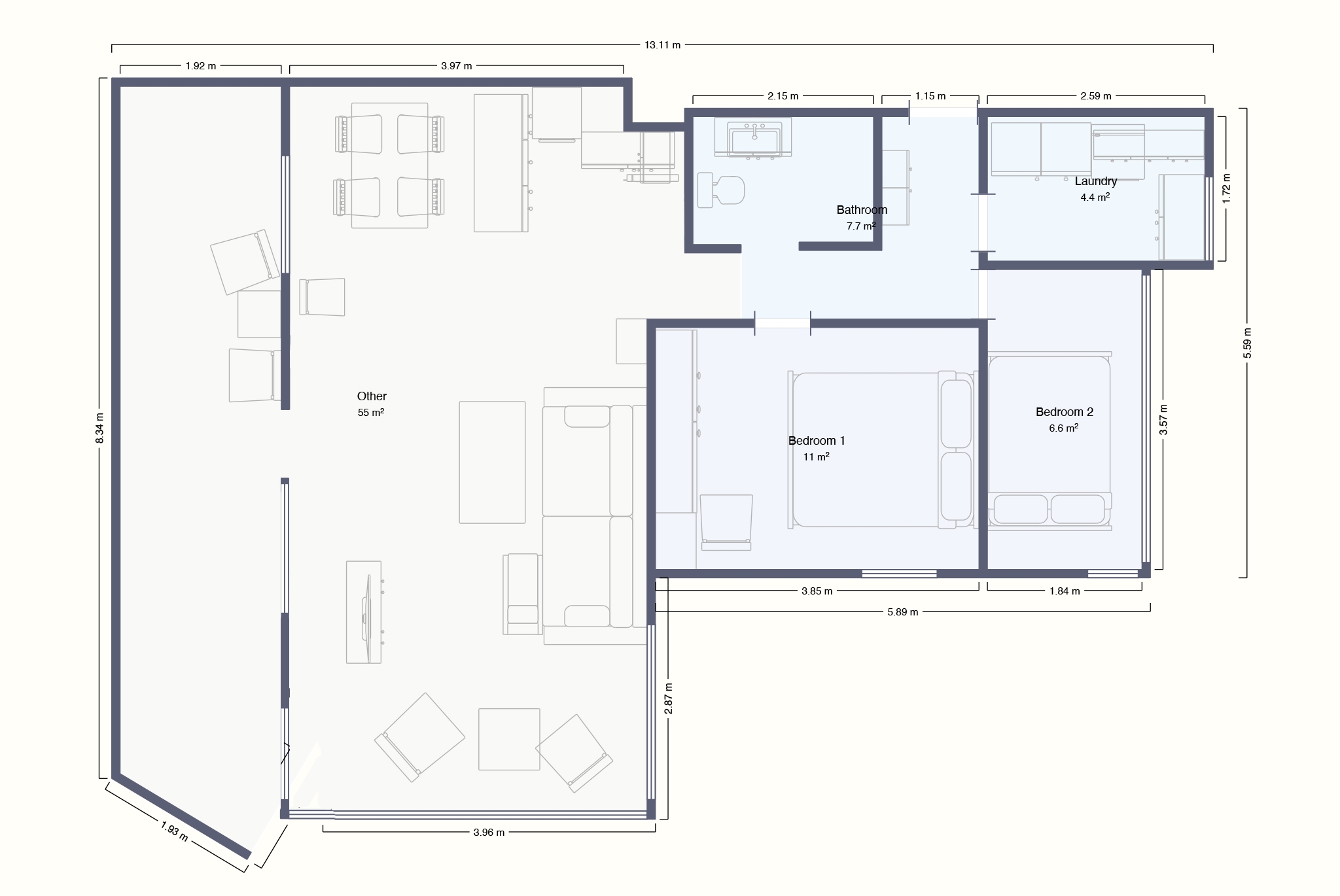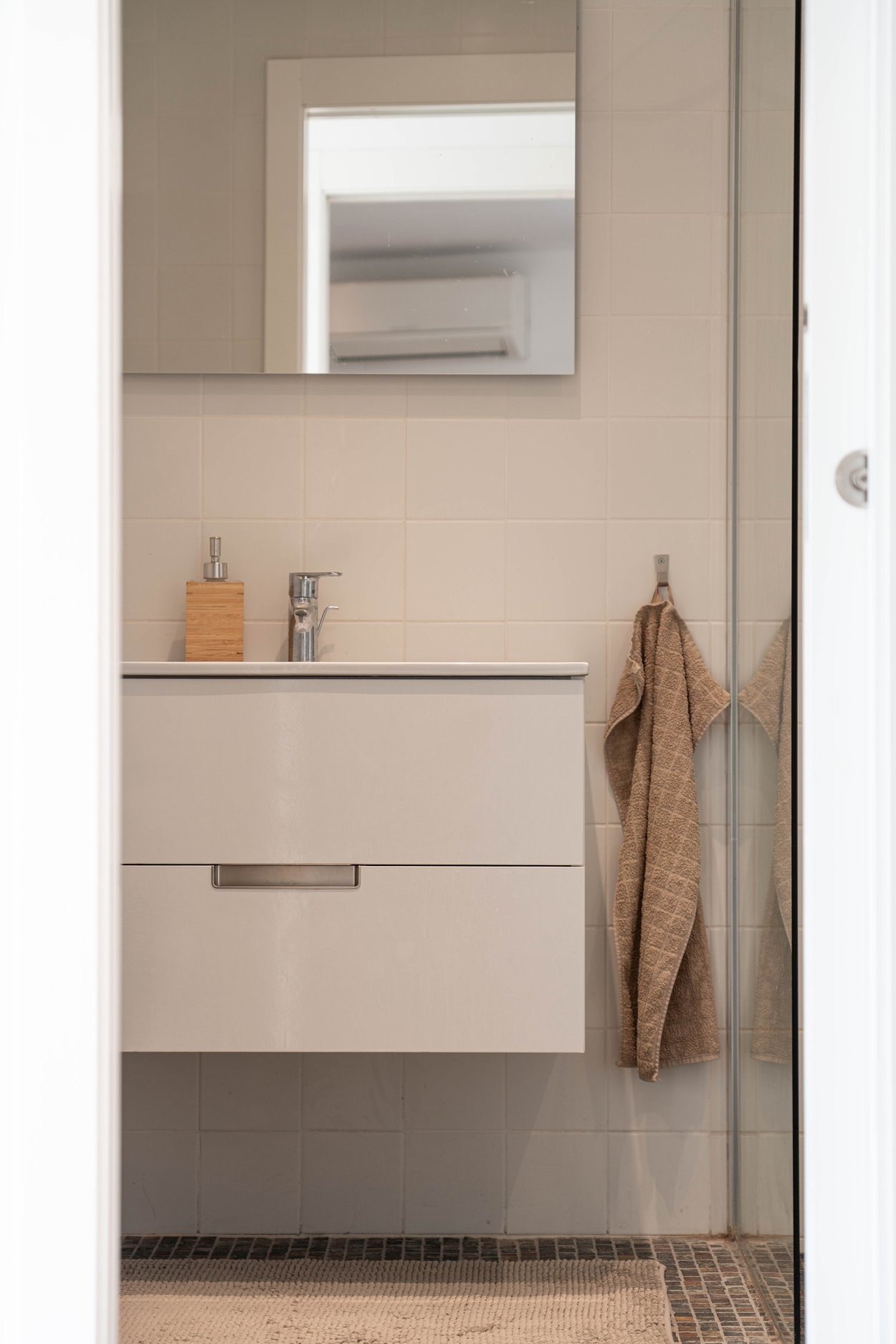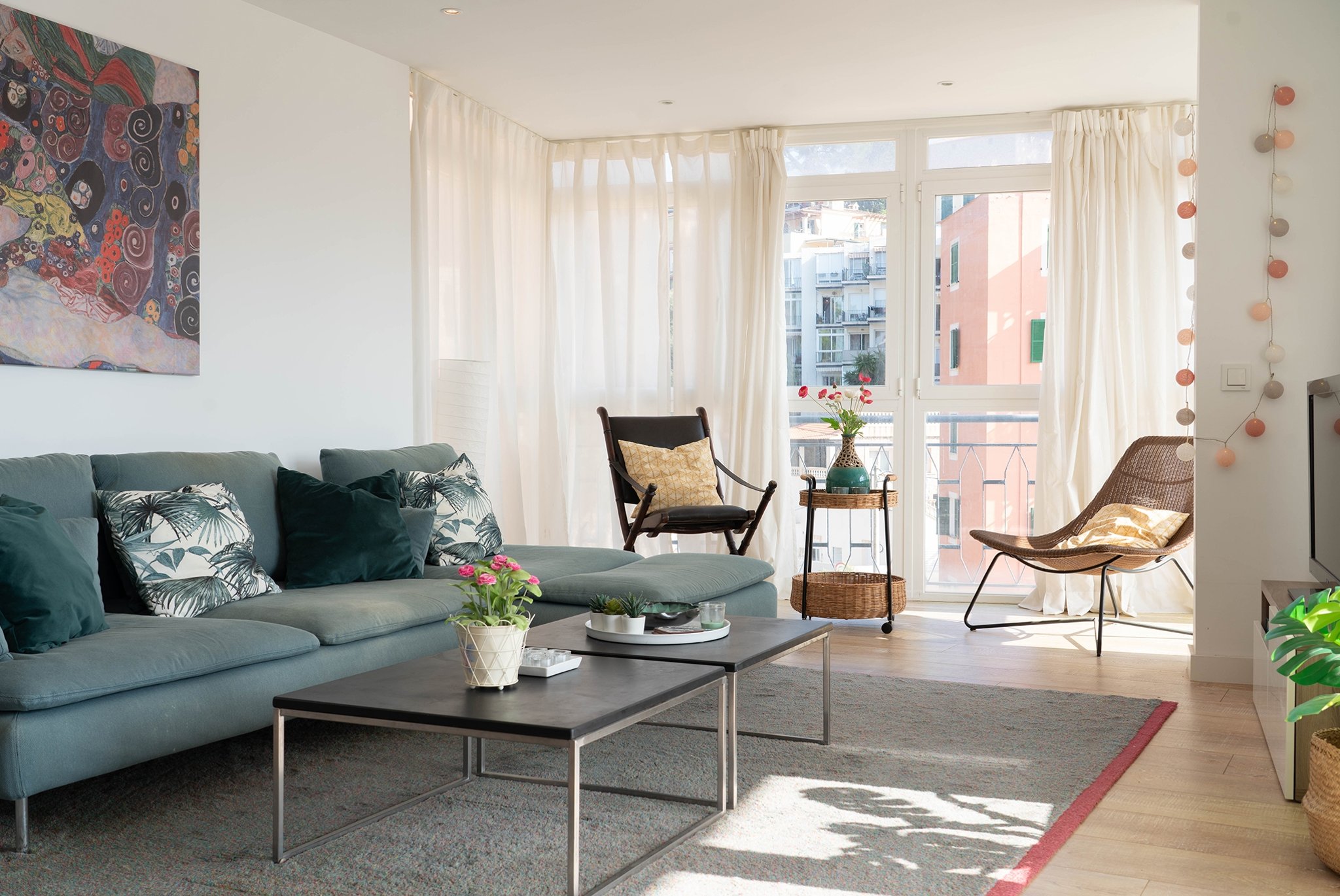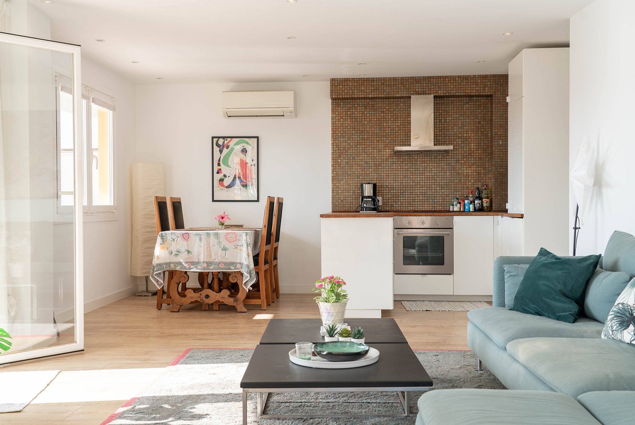 Lägenheten har en boyta på 70 m² och helrenoverades 2017. Här finns ett rymligt vardagsrum med ett öppet, modernt kök, som tillsammans med vardagsrummet har utgång till en terrass på 16 m². Bostaden erbjuder också två ljusa sovrum, ett modernt badrum samt en praktisk tvättstuga.