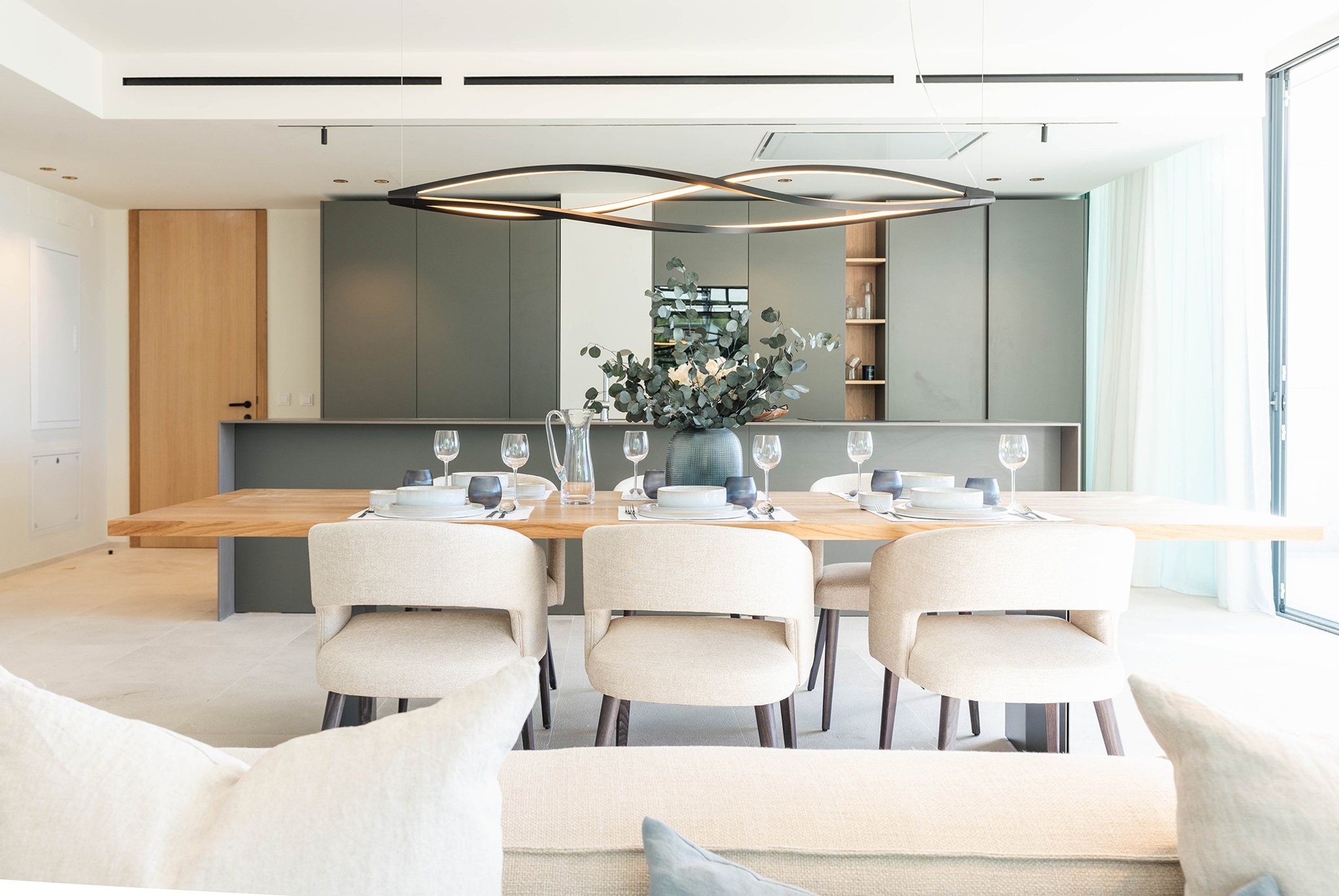 Penthouset utmärker sig genom sin utsökta kvalitet. Från grunden till inredningen är varje detalj noggrant utvald för att säkerställa högsta kvalitet. Interiören utstrålar elegans med materialval som natursten och ytskikt av ek. De öppna vardagsrummen och matplatserna smälter sömlöst samman med köken. Dessutom ger energieffektiv luftkonditionering, hemautomatisering och designerbelysning en modern och funktionell stil. För att ytterligare öka din komfort är varje lägenhet utrustad med ett praktiskt förråd och 2 parkeringsplatser.