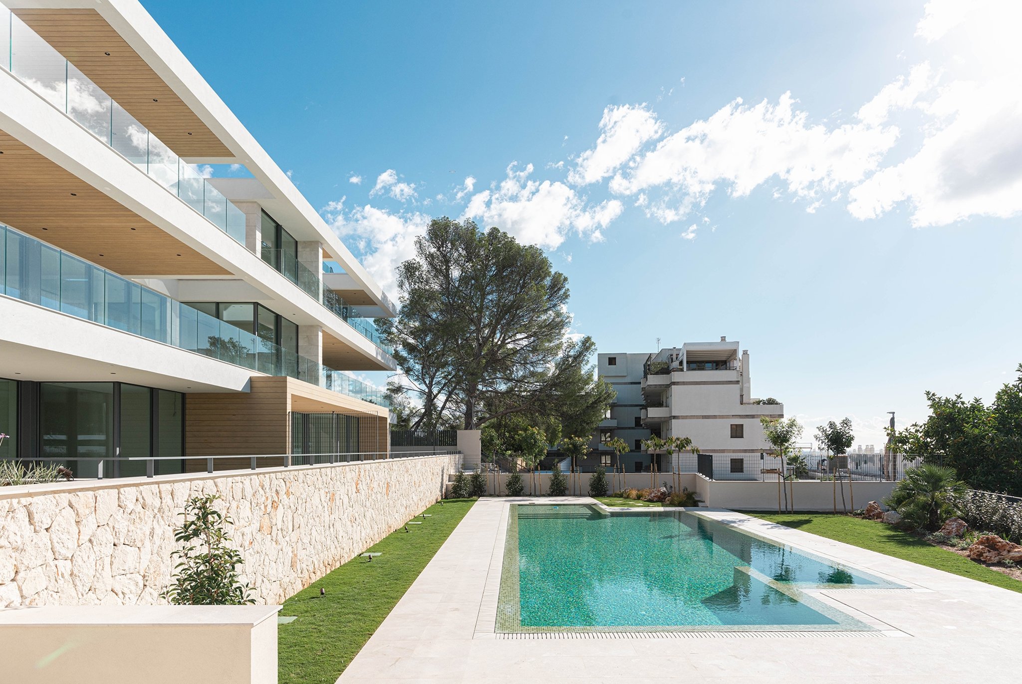 Byggnaderna är omgivna av medelhavsträdgårdar, två pooler och ett fitness- / spa-område.