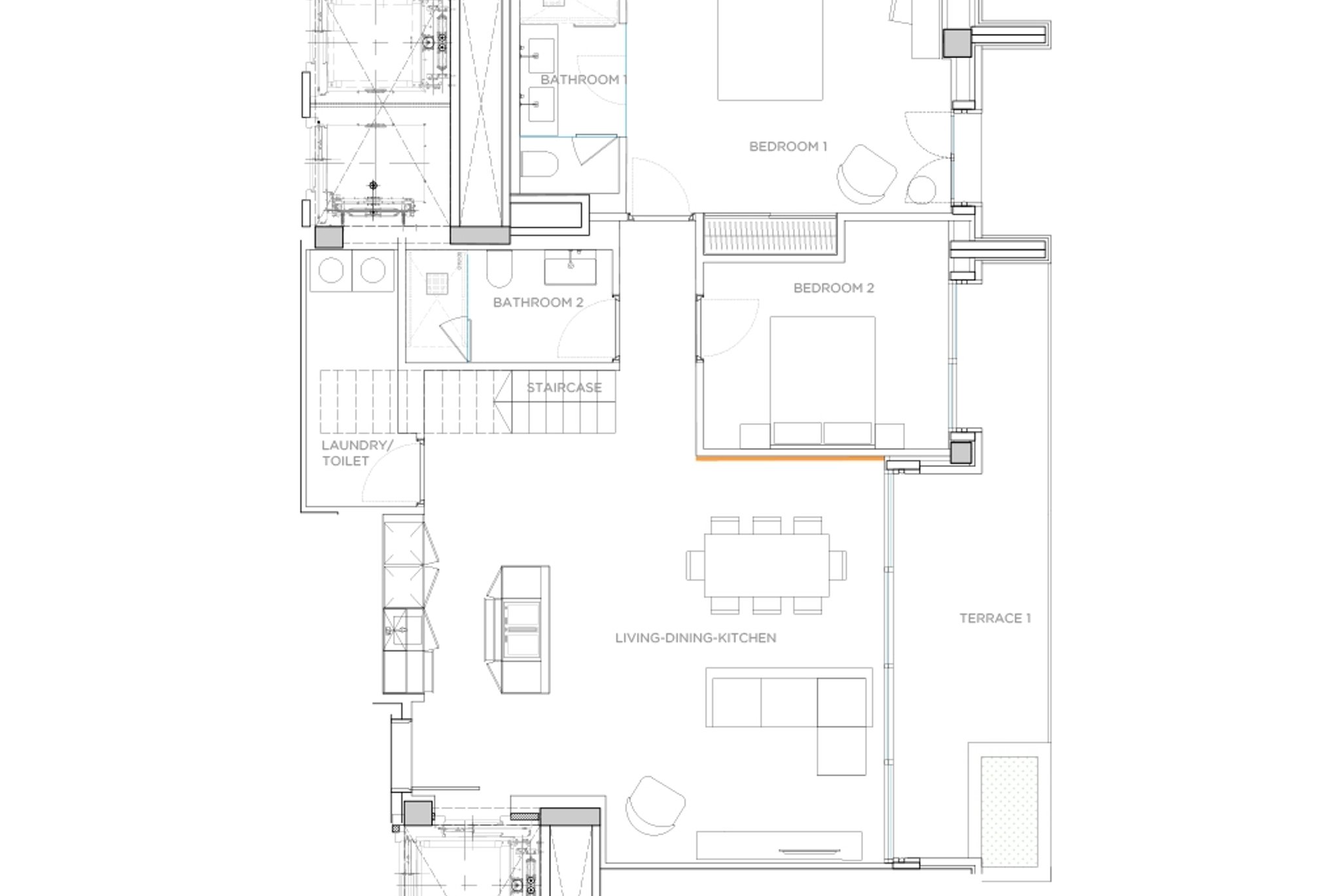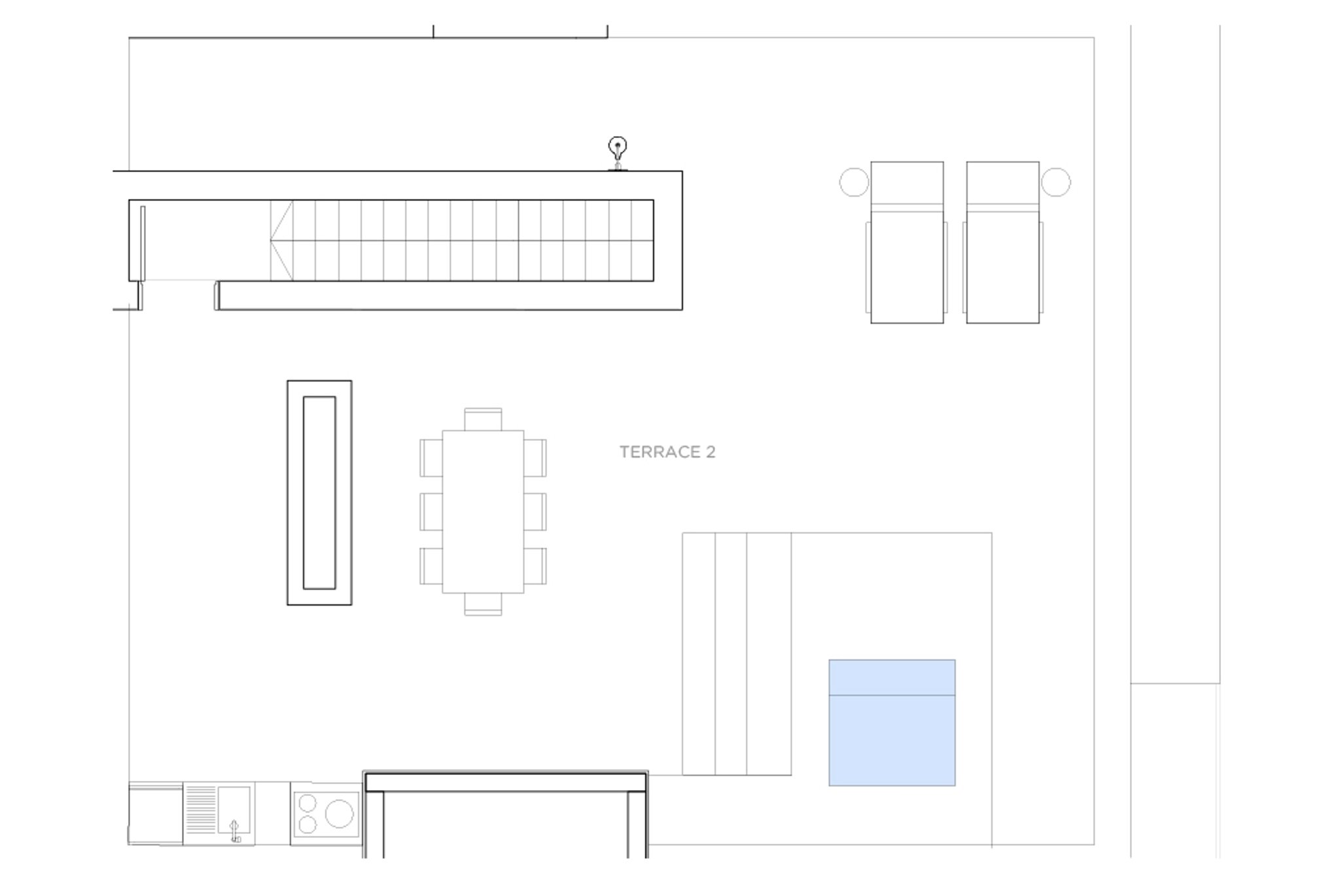 Denna lägenhet har en byggd yta på 103 m2 och en boyta på 90 m2 plus två terrasser på totalt 105 m2 och den ligger på sjätte våningen. Den består av 2 sovrum, 2 badrum och ett öppet kök och vardagsrum som öppnar upp till terrassen.