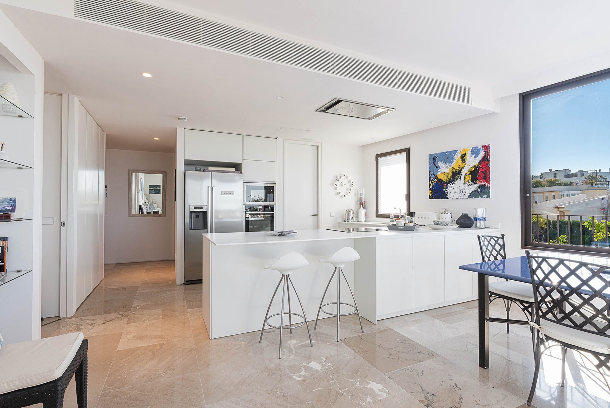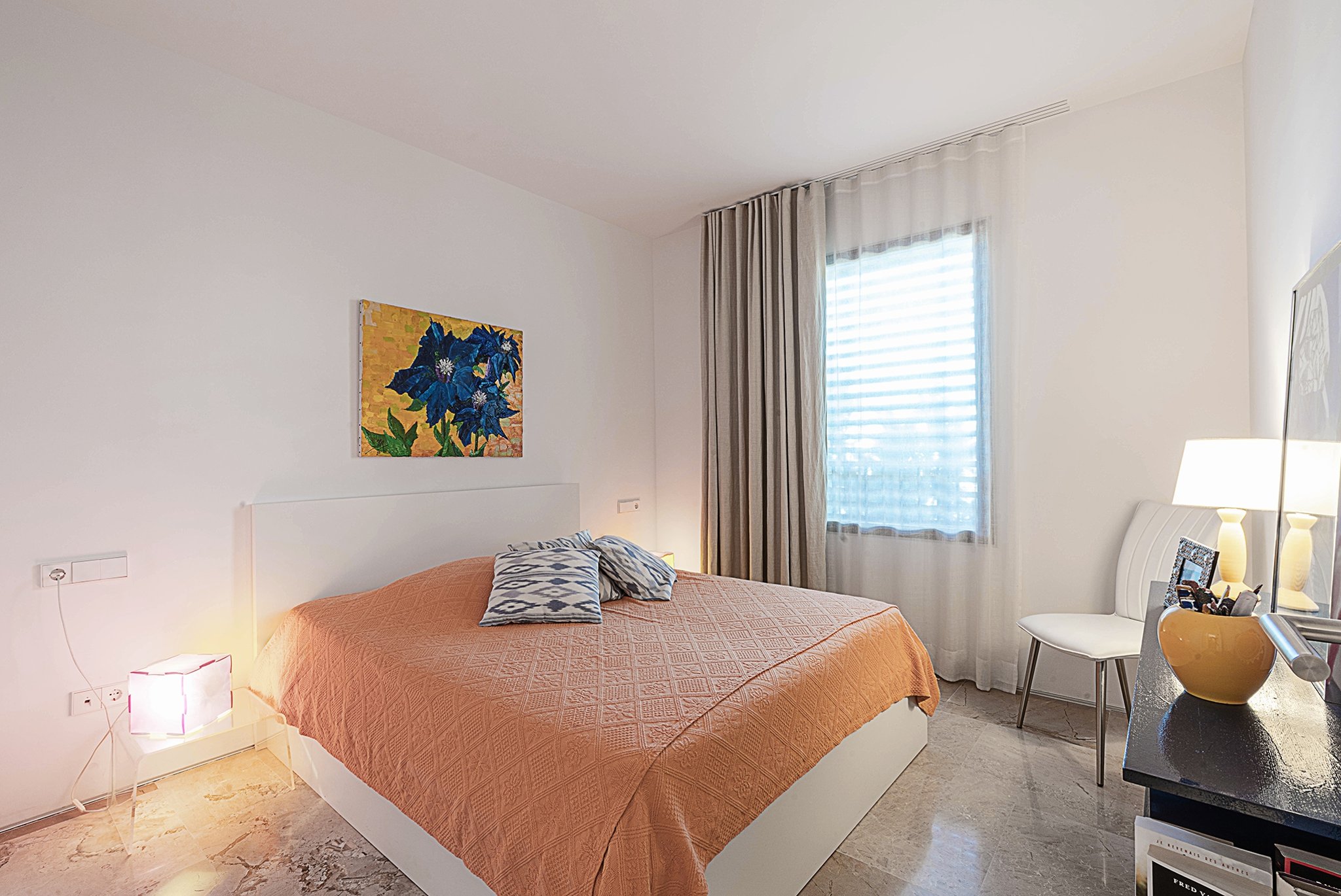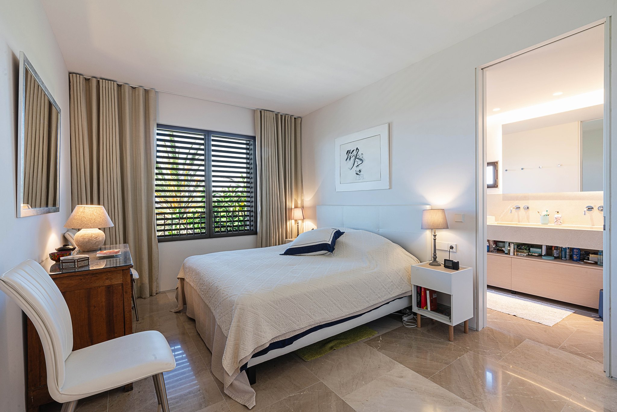 I lägenheten finner du bekvämligheter som AC, golvvärme, två parkeringsplatser i garage, förråd, samt en välskött community-area med saltvattenpool och vackra trädgårdar.
