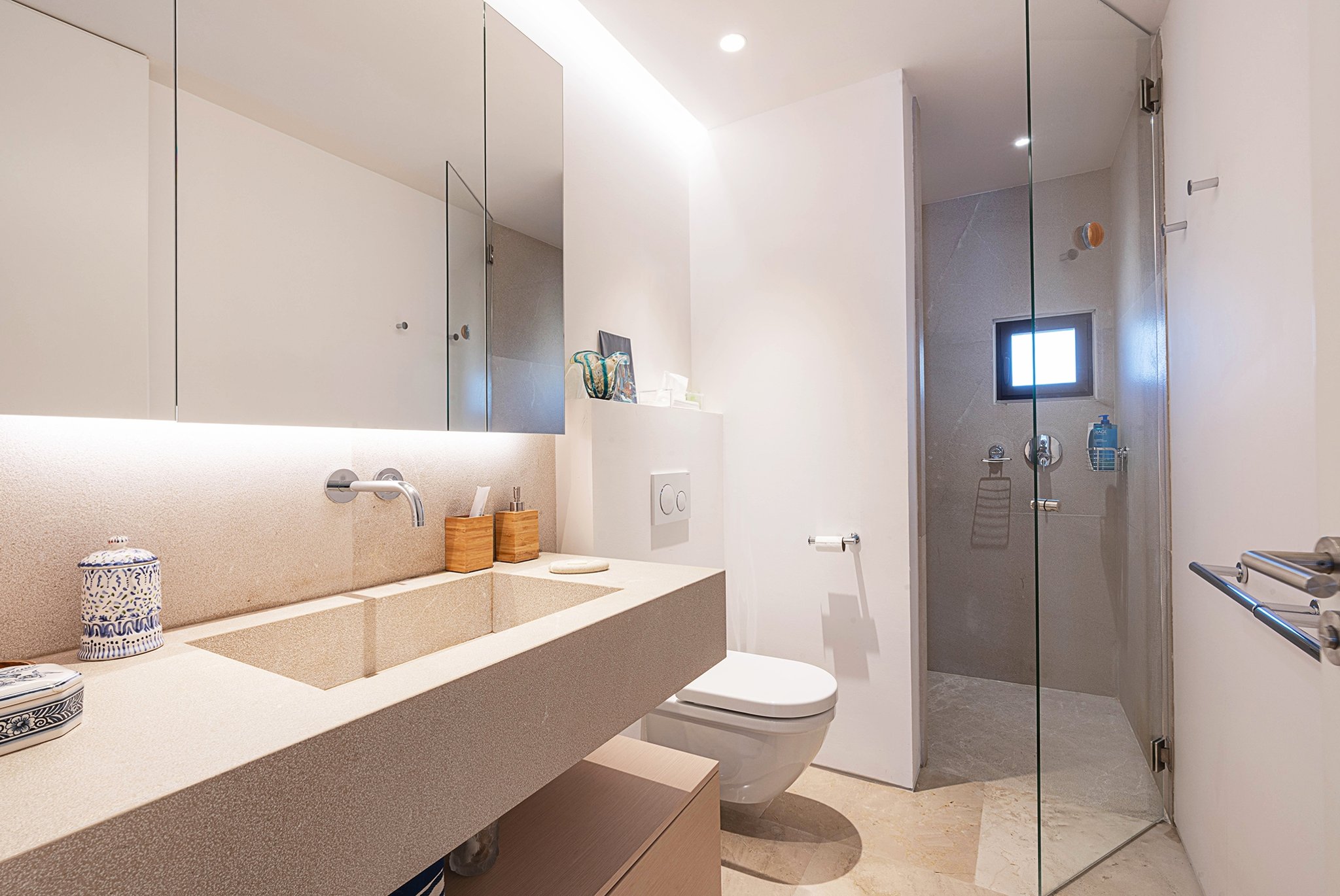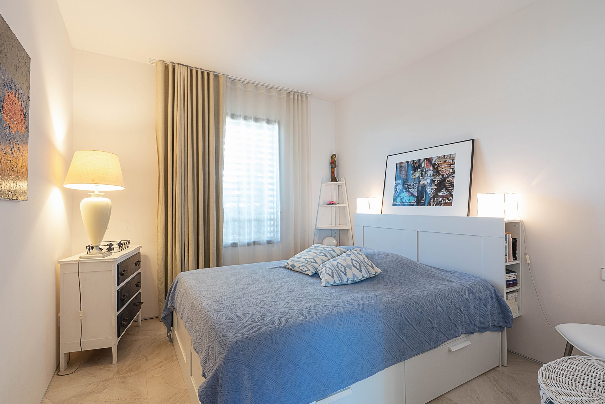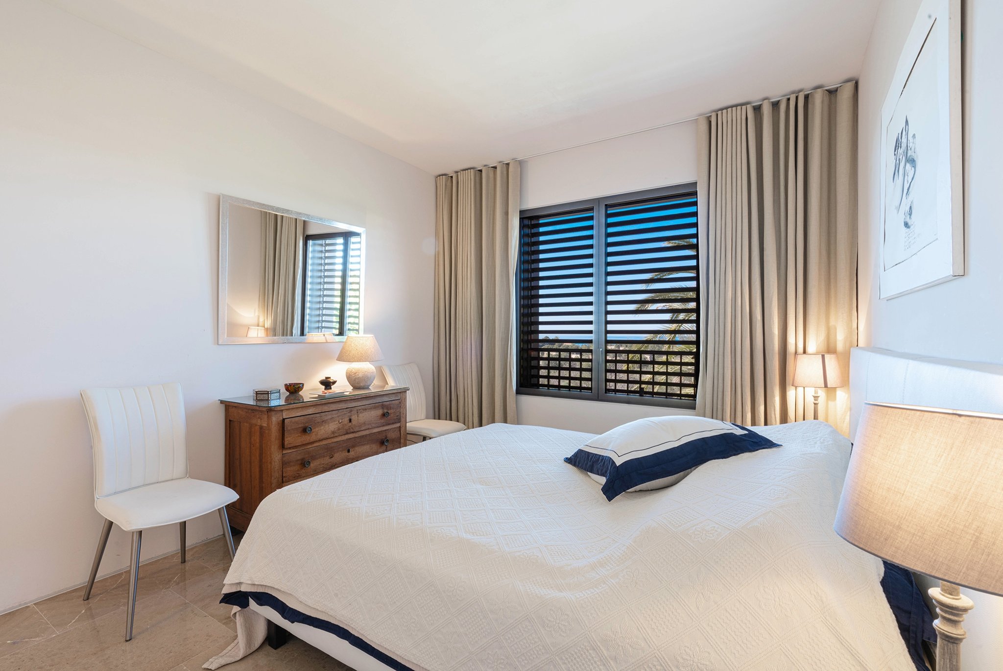 Lägenheten erbjuder också tre sovrum, där mastersovrummet har havsutsikt och ett badrum en suite. De andra sovrummen är båda rymliga och har plats för dubbelsäng. Det finns även två ytterligare badrum.