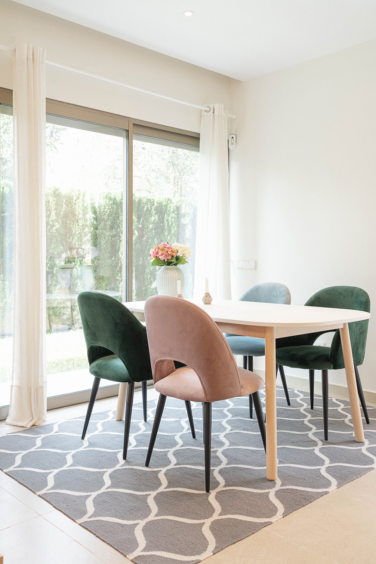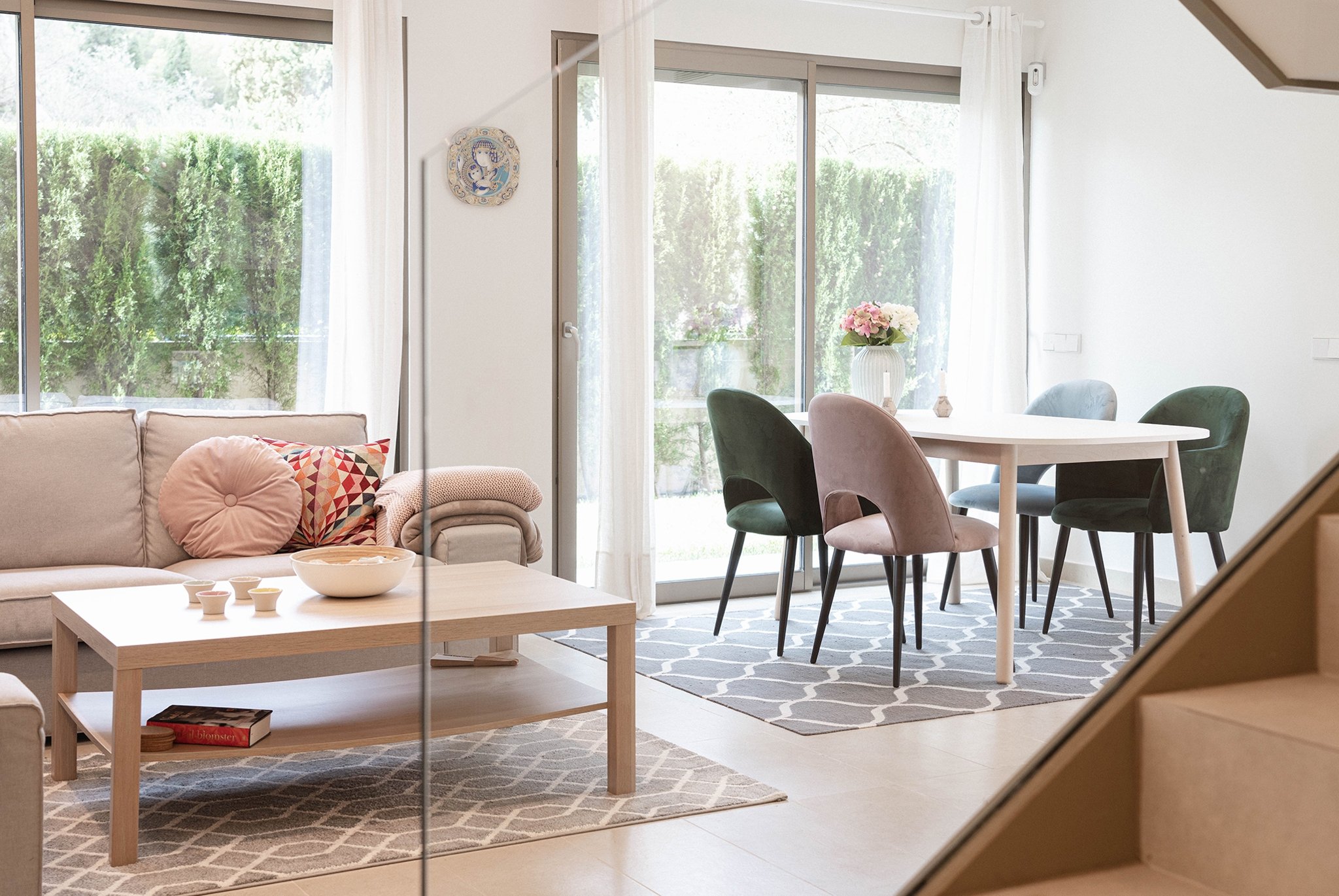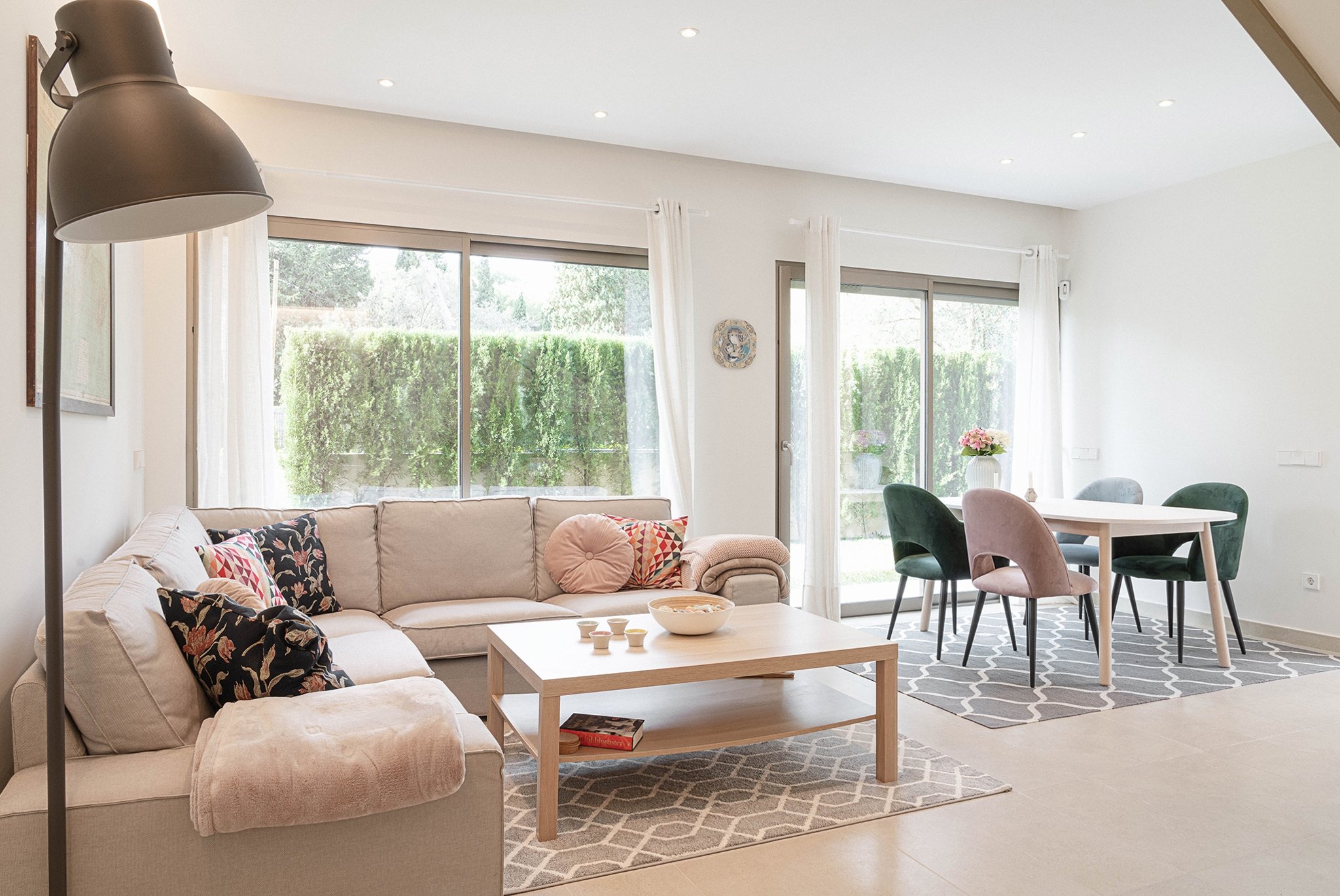 Etagelägenheten har en boyta om 134 m² fördelad på två våningar. På entréplanet möts du av ett stilrent kök och vardagsrum i öppen planlösning, ett sovrum samt en gästtoalett. Från både kök och vardagsrum har man direkt tillgång till den generösa terrassen och den privata trädgården som löper i L-form runt bostaden – perfekt för både avkoppling och sociala tillställningar. Från den privata trädgården har man direkt tillgång till det härliga gemensamma poolområdet.