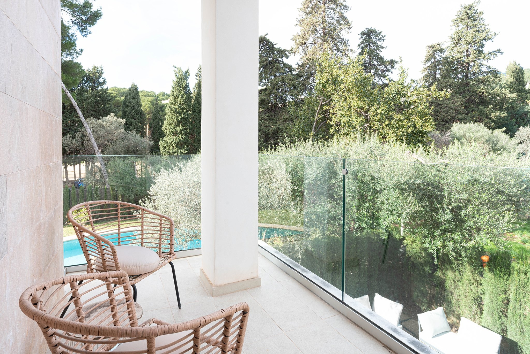 På övervåningen finns tre rymliga sovrum, samtliga med egna badrum en suite. Master bedroom erbjuder dessutom en walk-in closet, och ett av sovrummen har utgång till en trevlig balkong.