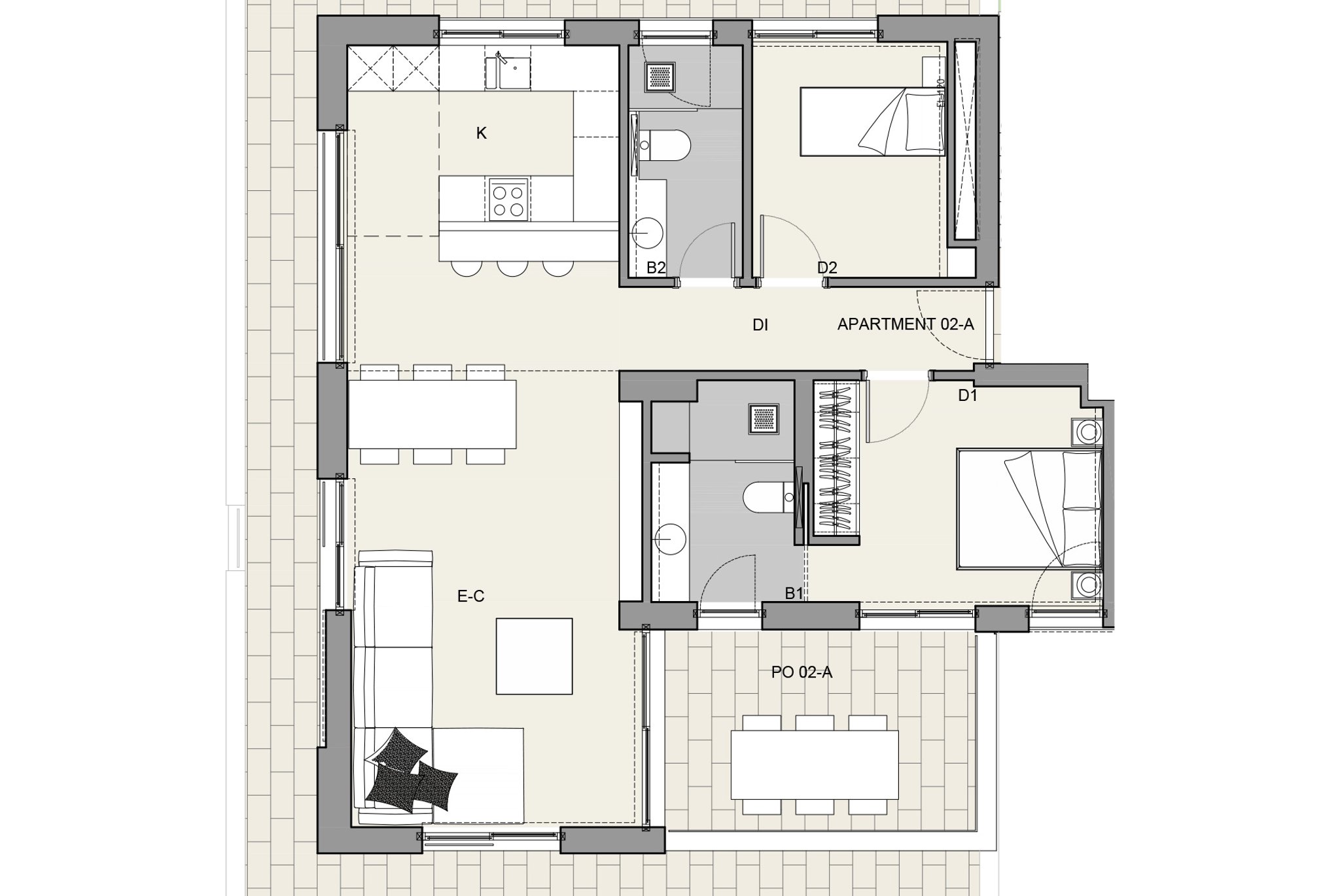 Denna ljusa och moderna lägenhet är belägen på andra våningen med en terrass på 12 m2 som man når från både vardagsrummet och huvudsovrummet. Bostaden på 94 m2 består av 2 sovrum och 2 badrum och ett stort vardagsrum som öppnar upp mot terrassen. Köket ligger i en öppen planlösning mot vardagsrummet och är fullt utrustat med köksutrustning från Siemens eller liknande märke. Hela bostaden har golvvärme och luftkonditionering. 1 parkeringsplats och ett förrådsutrymme är inkluderat.