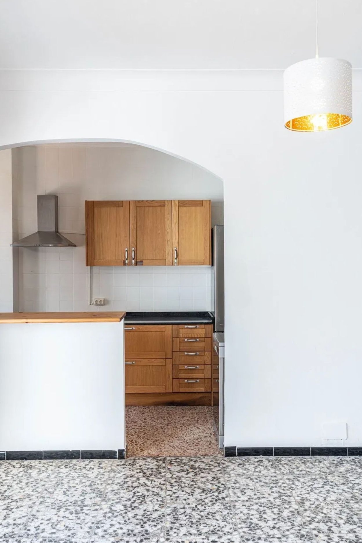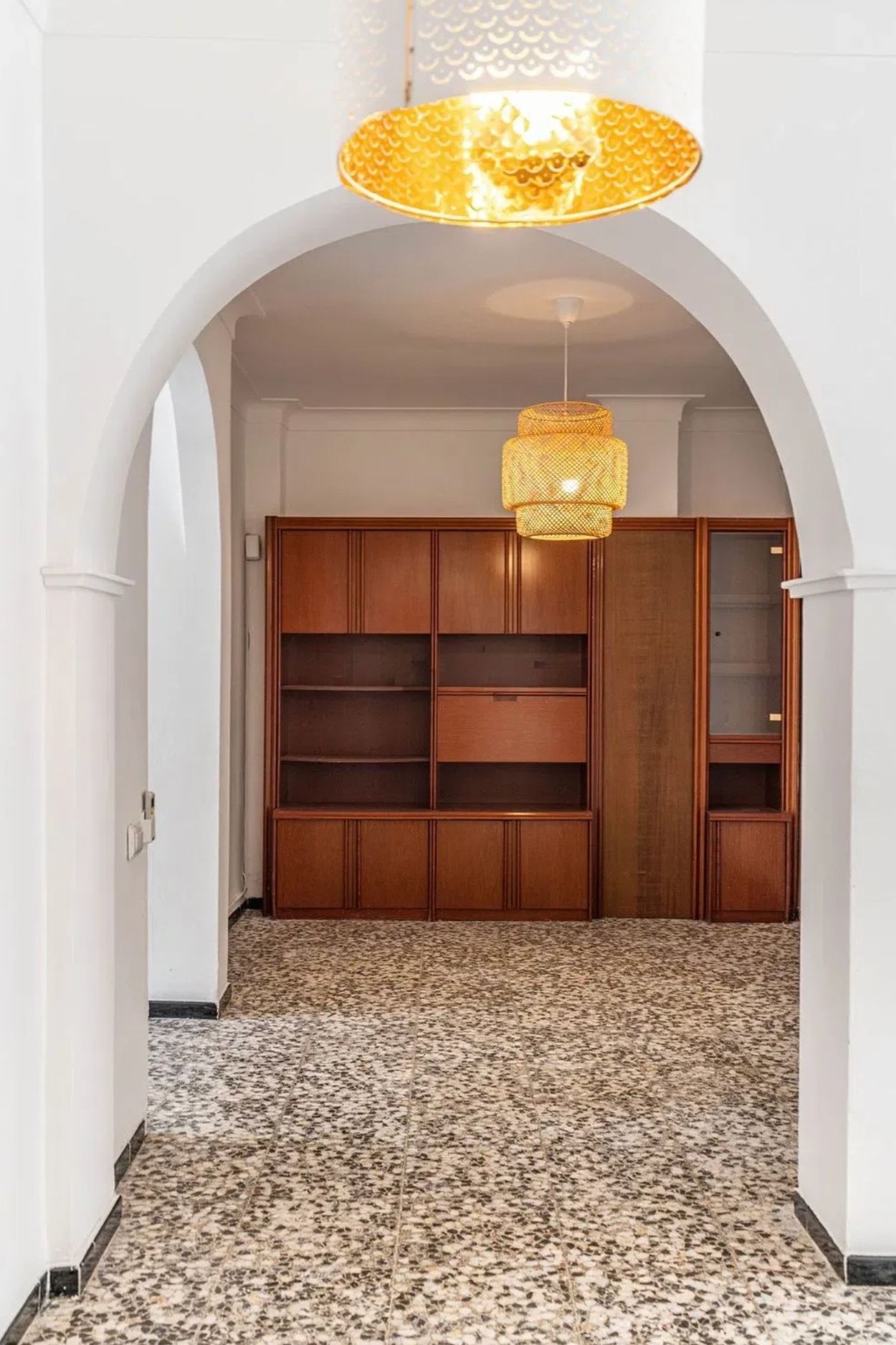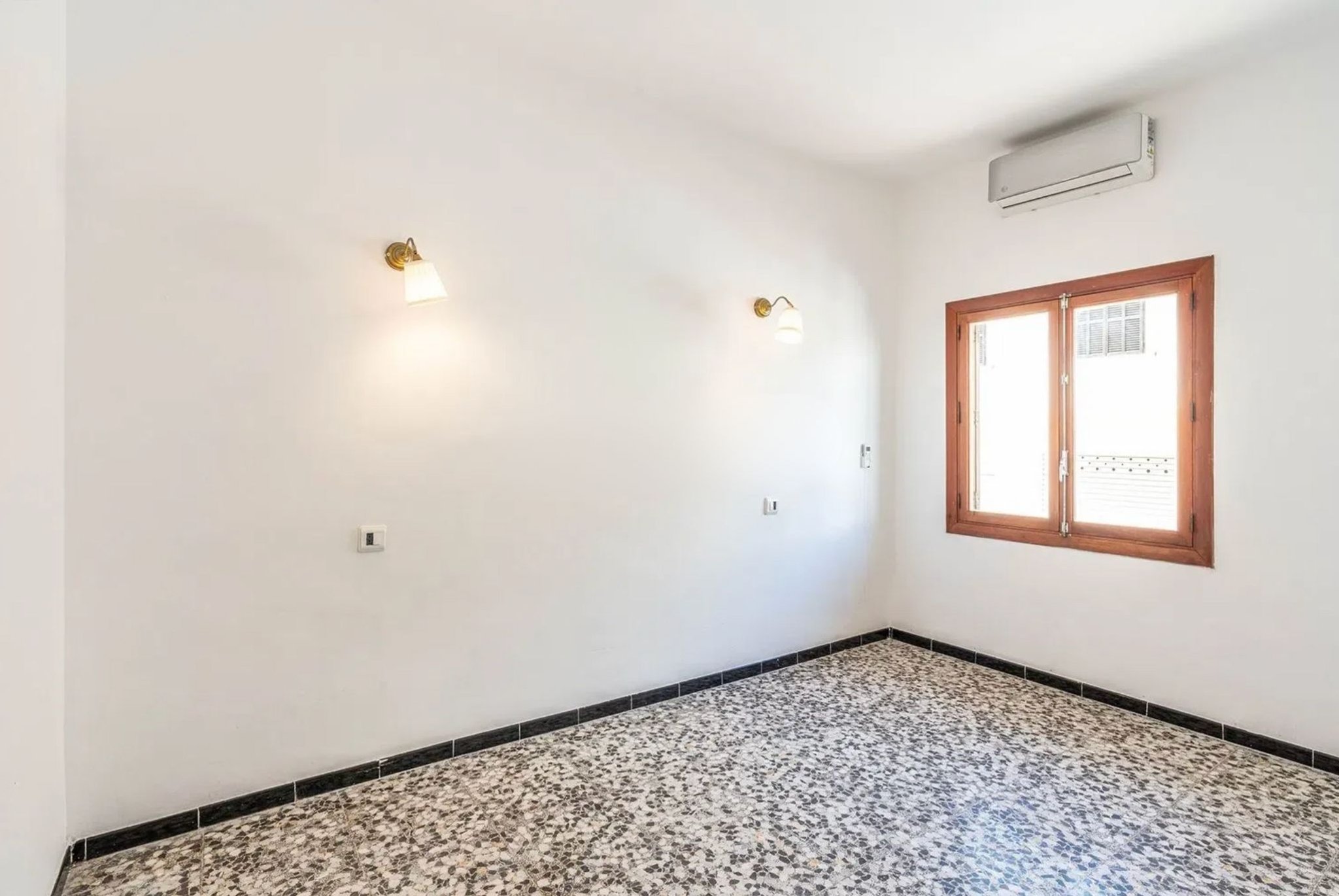 Lägenheten har fina träfönster, luftkonditionering och originalgolv av terrazzo, men är i behov av en renovering.