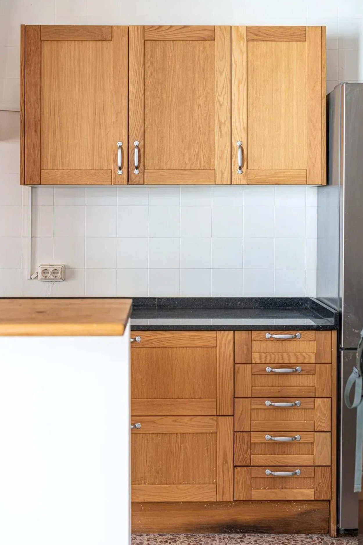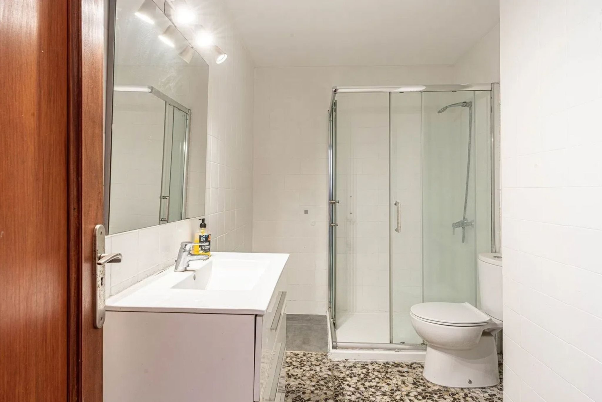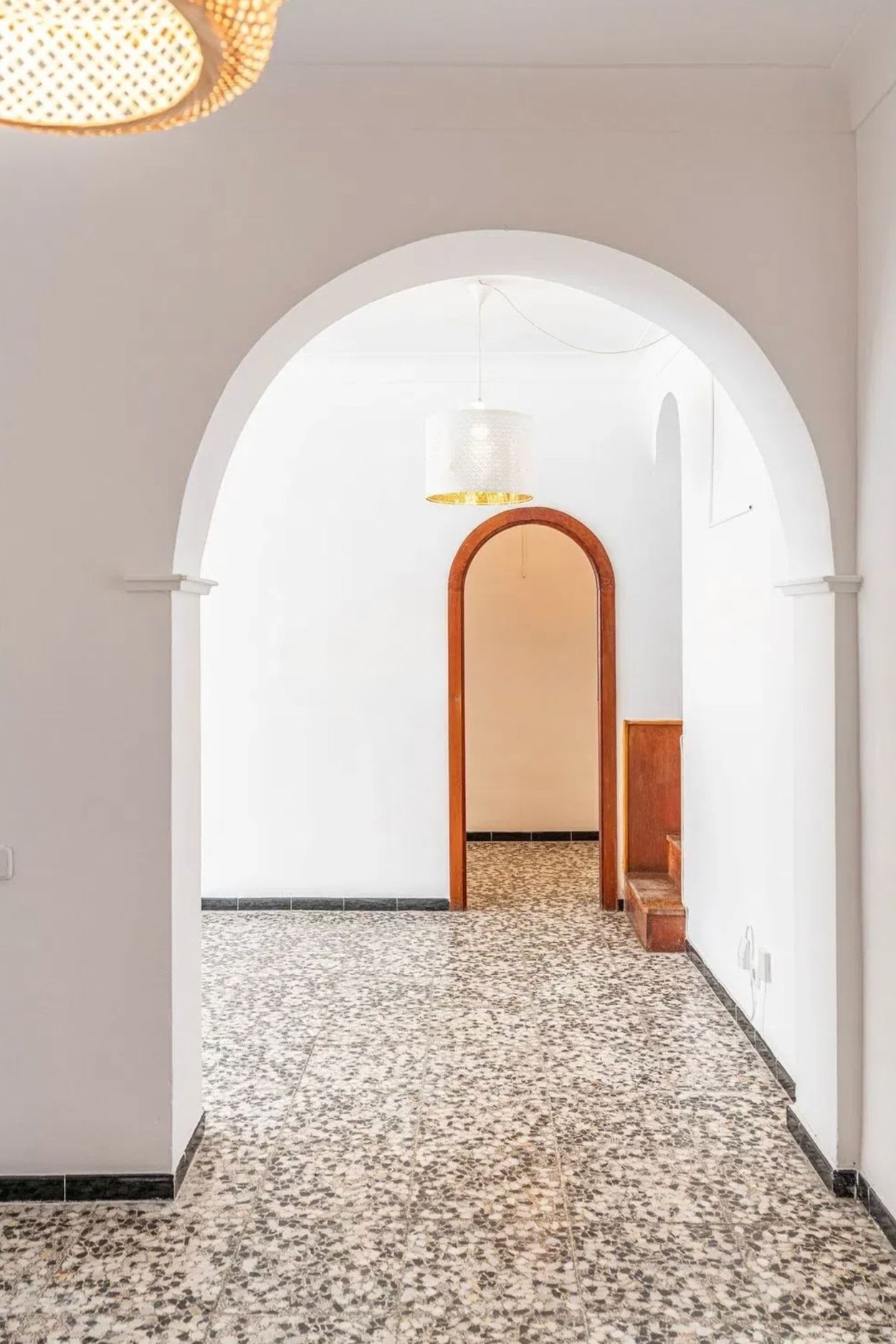 Lägenheten har fina träfönster, luftkonditionering och originalgolv av terrazzo, men är i behov av en renovering.