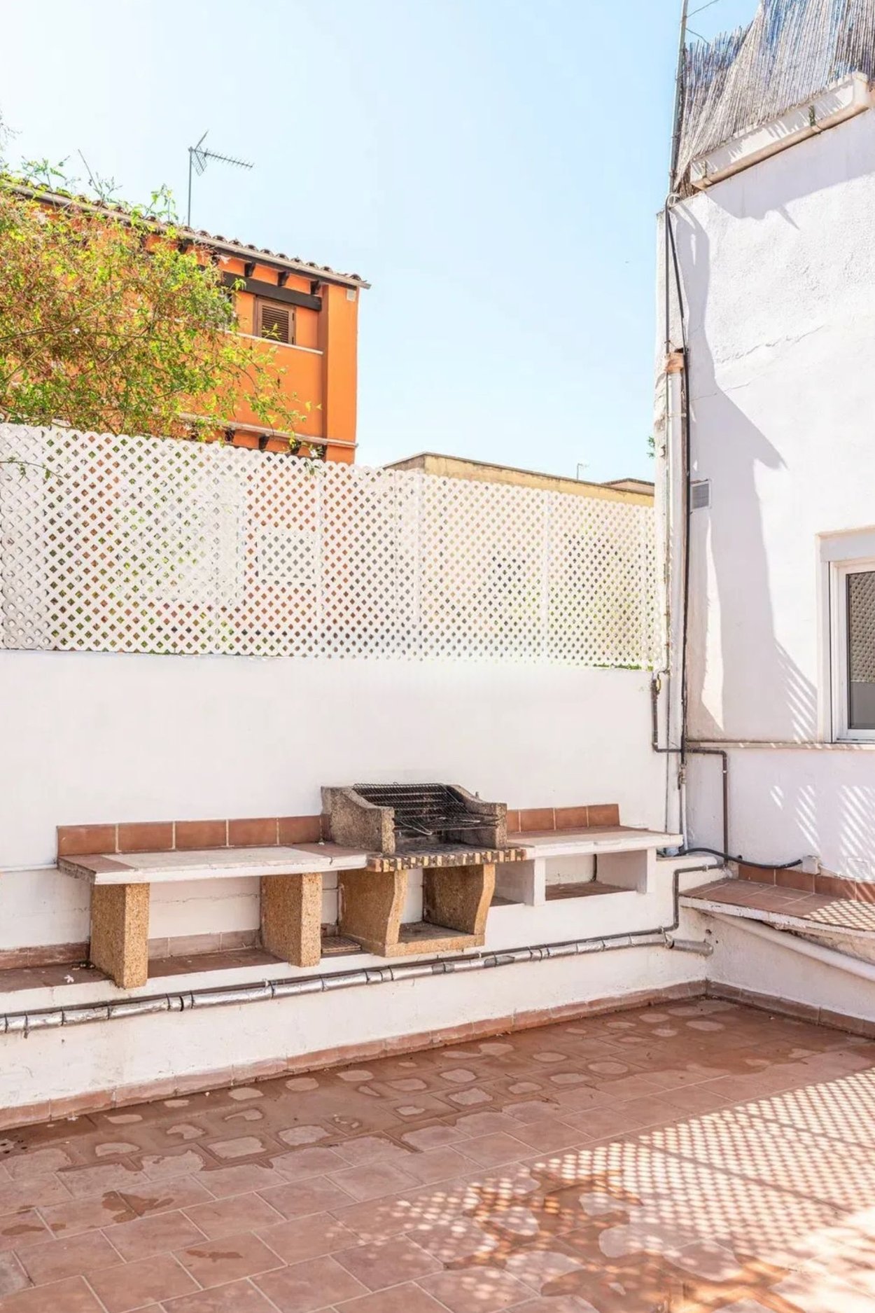 Lägenheten består av tre sovrum och ett badrum, men det finns plats för ytterligare ett badrum och sovrum om så önskas. Bostaden är belägen i en mindre fastighet med endast fyra lägenheter och är i visst behov av renovering. Det öppna köket och vardagsrummet har stora fönsterpartier och ett härligt ljusinsläpp. Härifrån kommer man direkt ut på den delvis täckta terrassen och den stora pation som har vacker grönska och en platsbyggd grill.