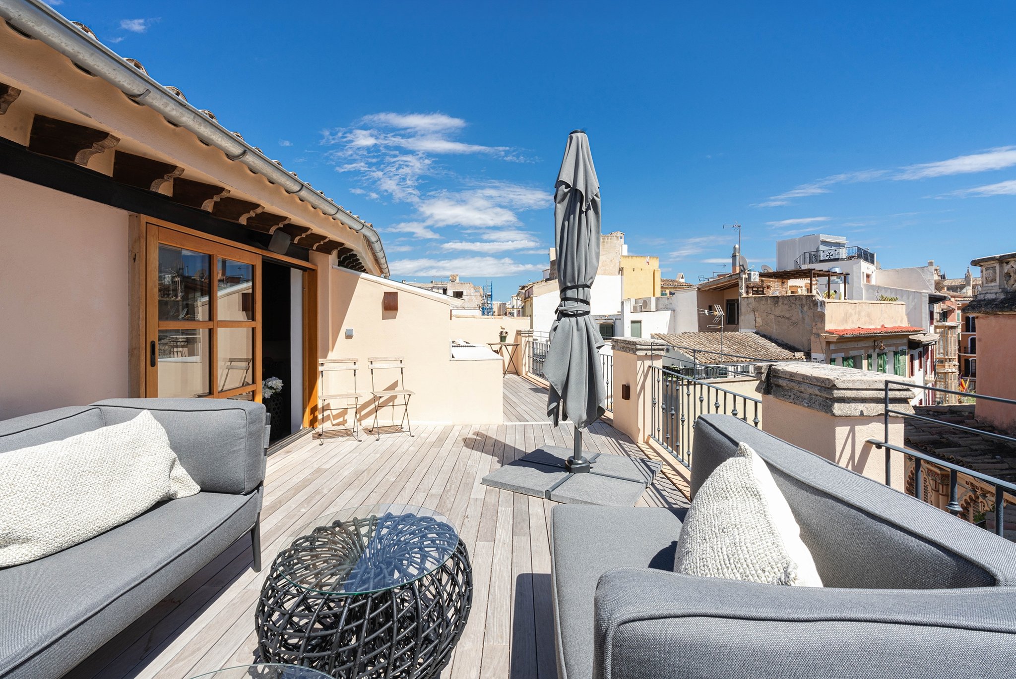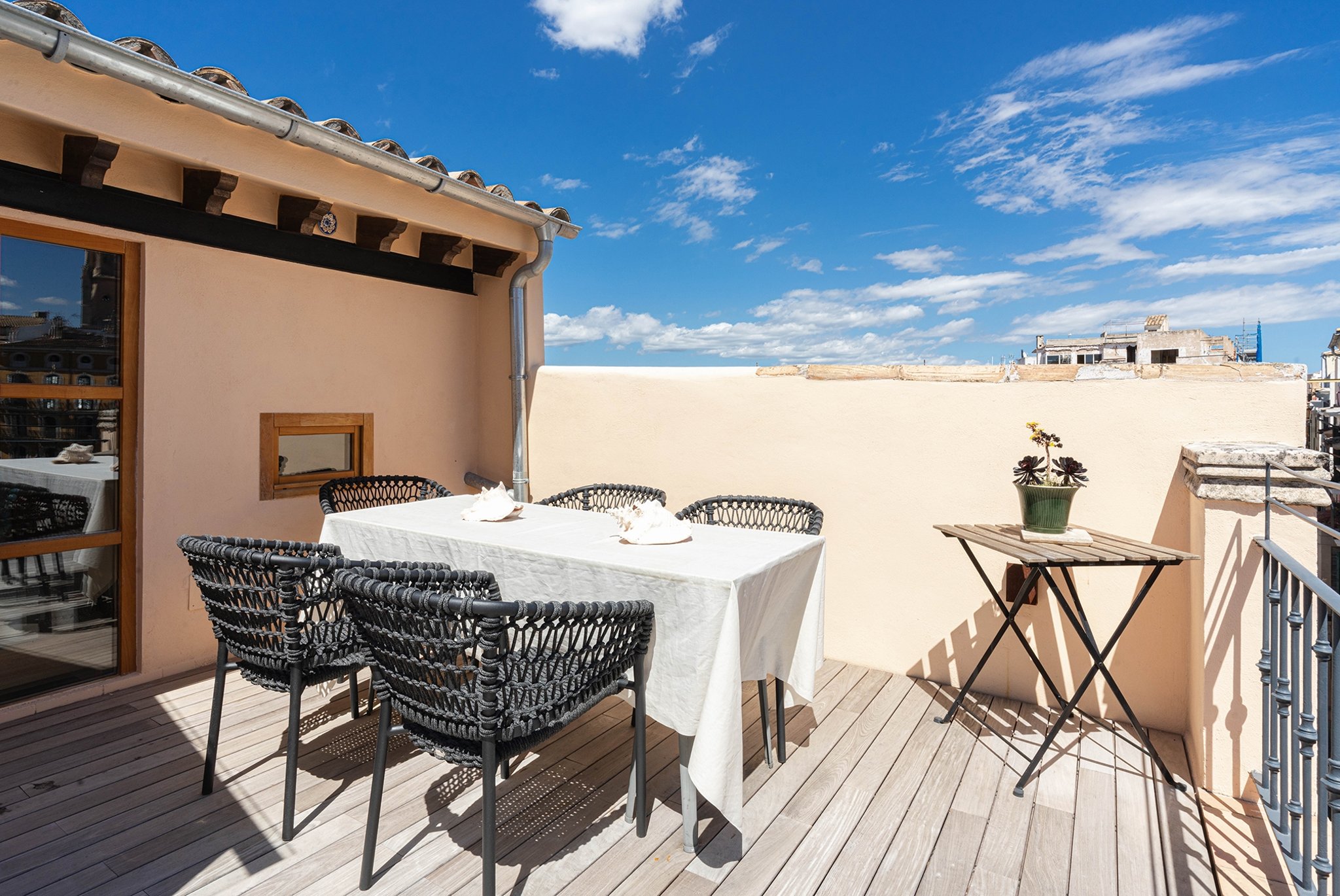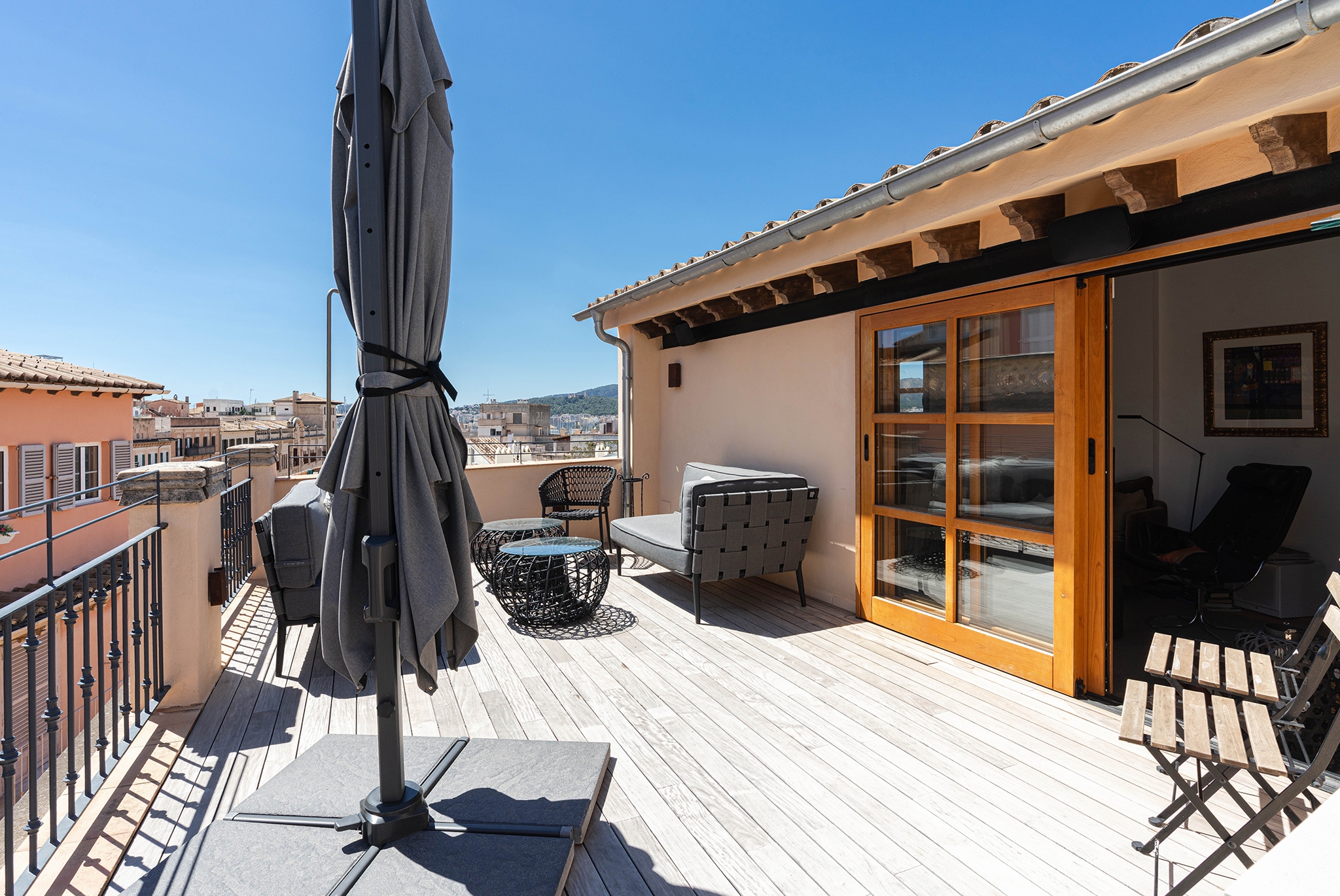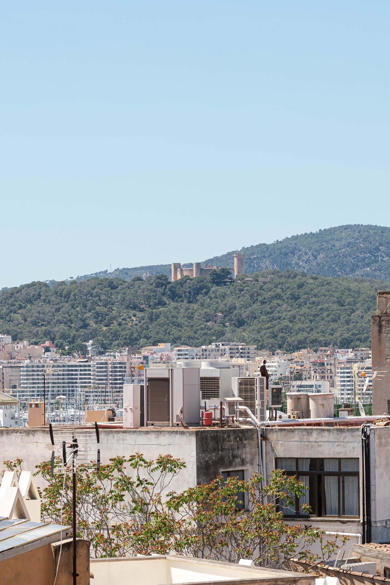Takvåningen sträcker sig över hela det översta planet på en byggnad med fem våningar utan hiss. Planlösningen är alldeles utmärkt och både vardagsrummet, matrummet och köket vetter ut mot den stora terrassen som har sol hela dagen. De båda sovrummen har plats för dubbelsäng och har båda vacker utsikt över staden. Mitt emellan sovrummen ligger badrummet, även det med fönster med utsikt över Palmas takåsar.