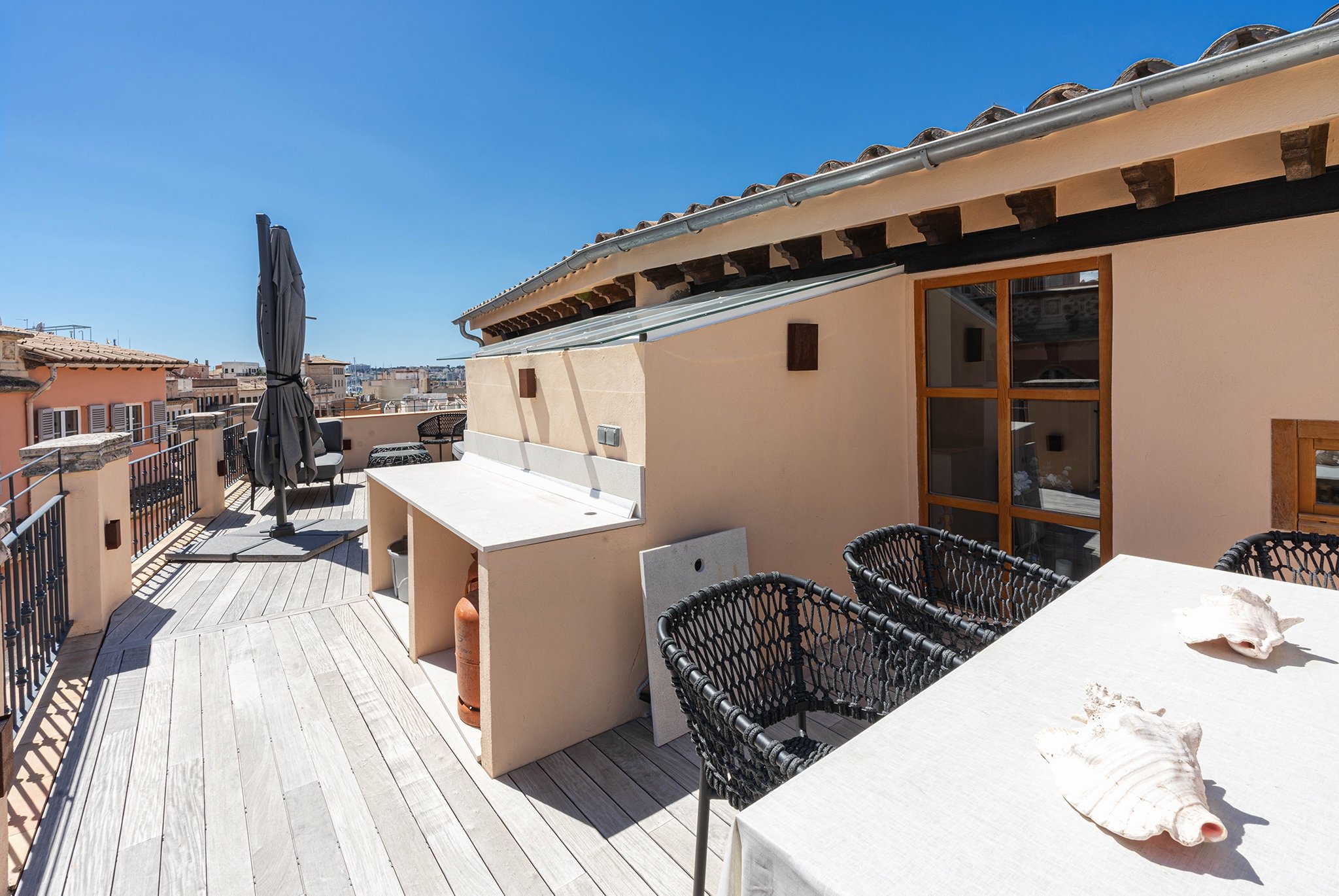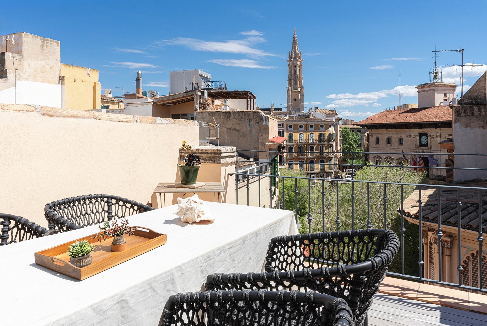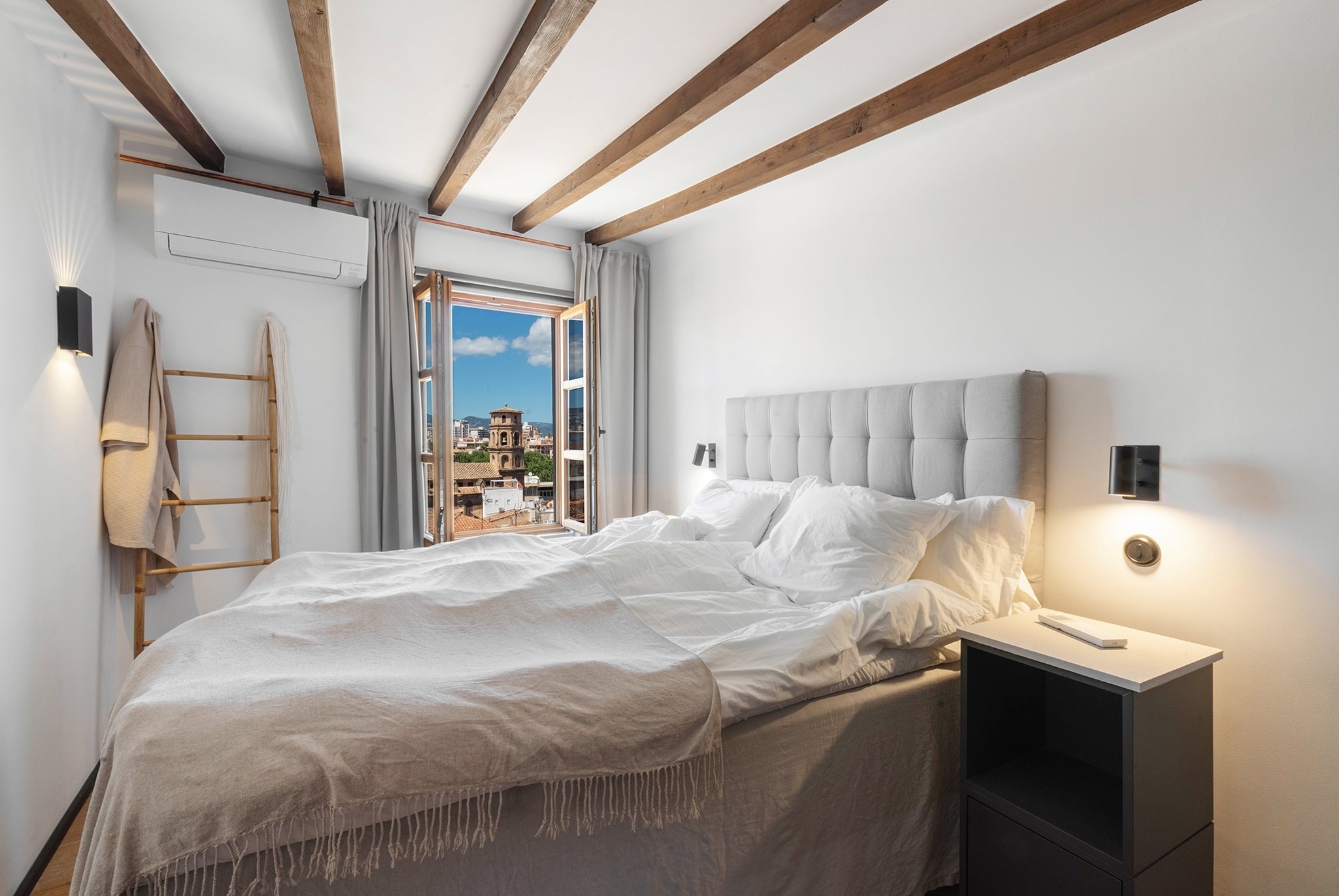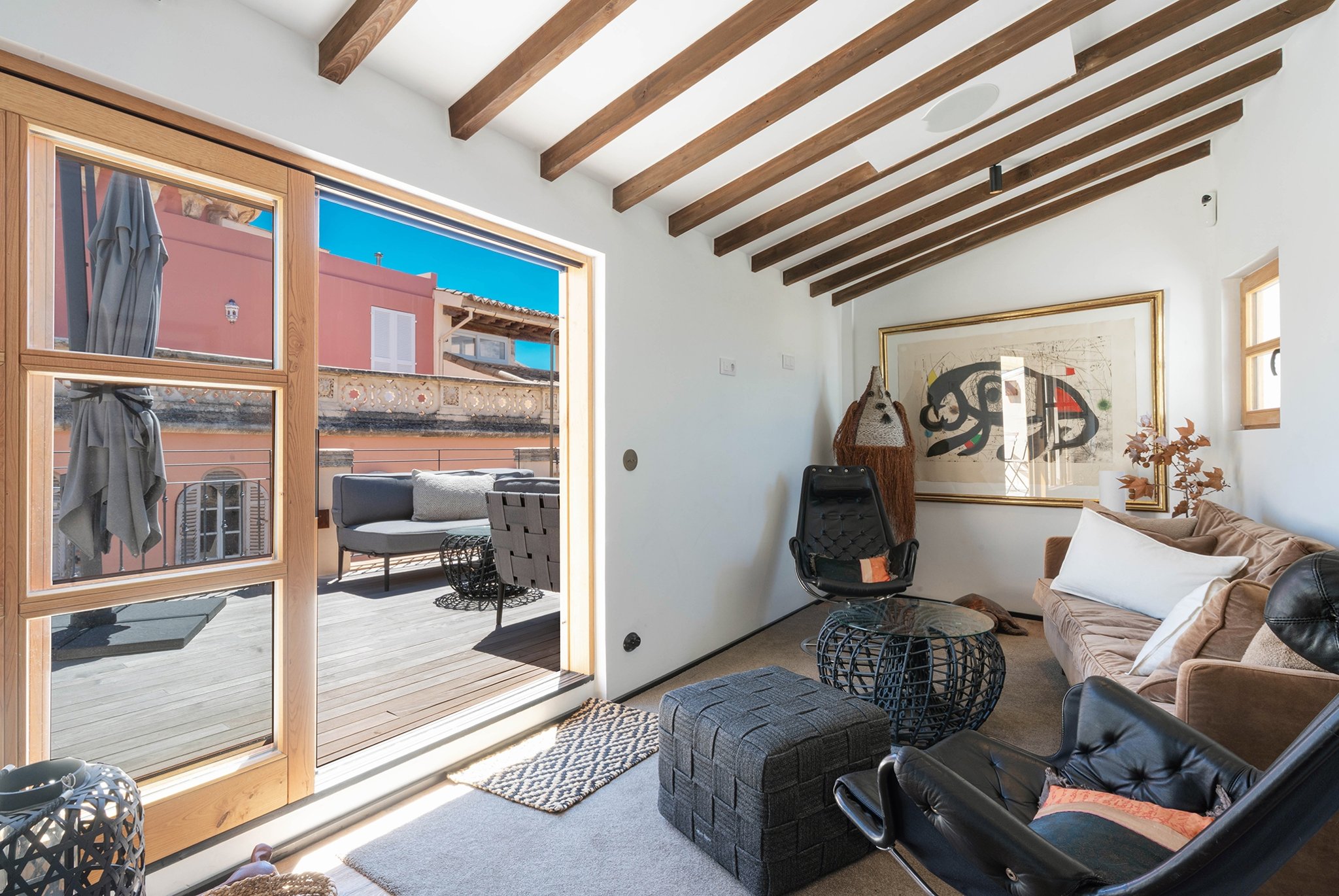 Takvåningen sträcker sig över hela det översta planet på en byggnad med fem våningar utan hiss. Planlösningen är alldeles utmärkt och både vardagsrummet, matrummet och köket vetter ut mot den stora terrassen som har sol hela dagen. De båda sovrummen har plats för dubbelsäng och har båda vacker utsikt över staden. Mitt emellan sovrummen ligger badrummet, även det med fönster med utsikt över Palmas takåsar.