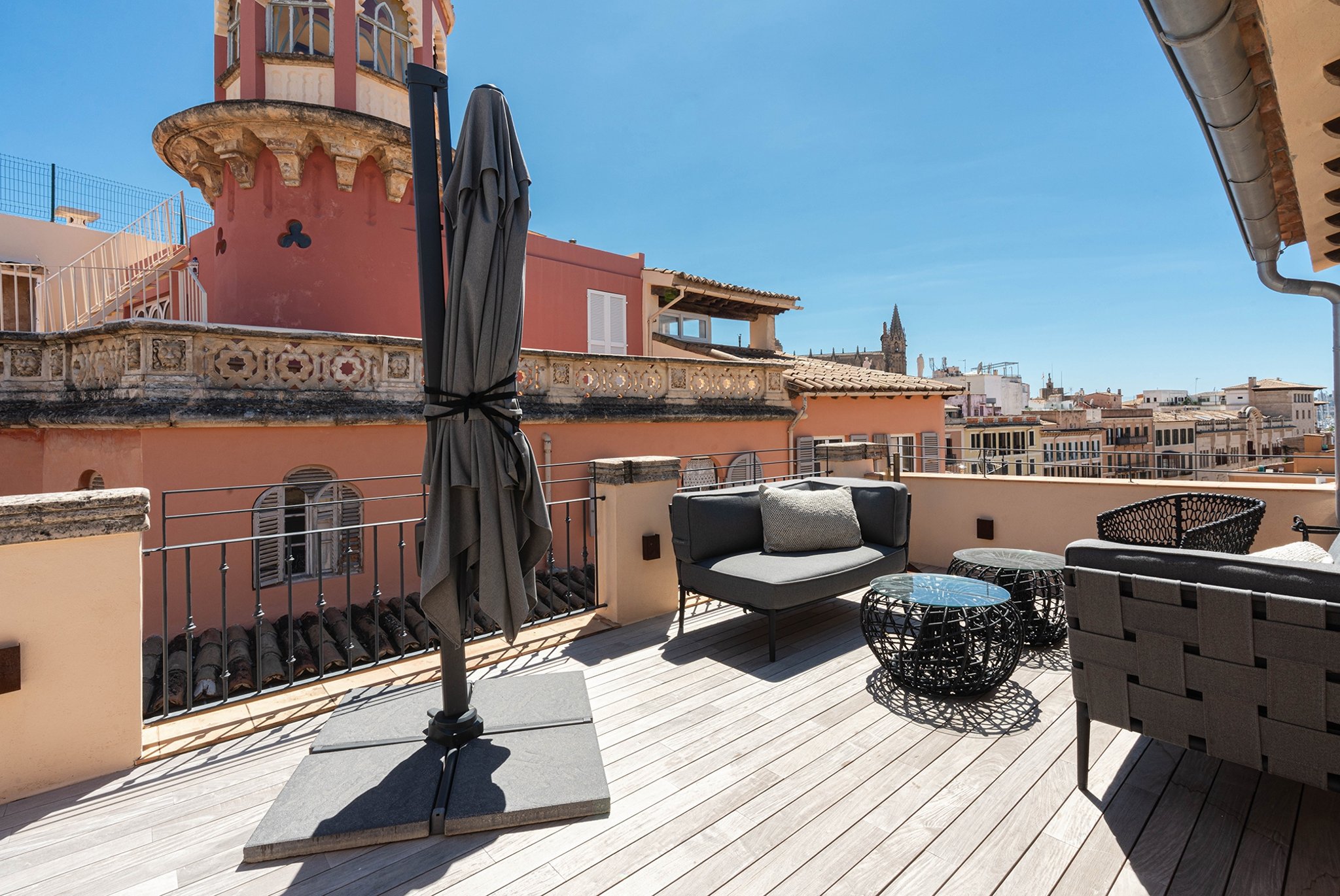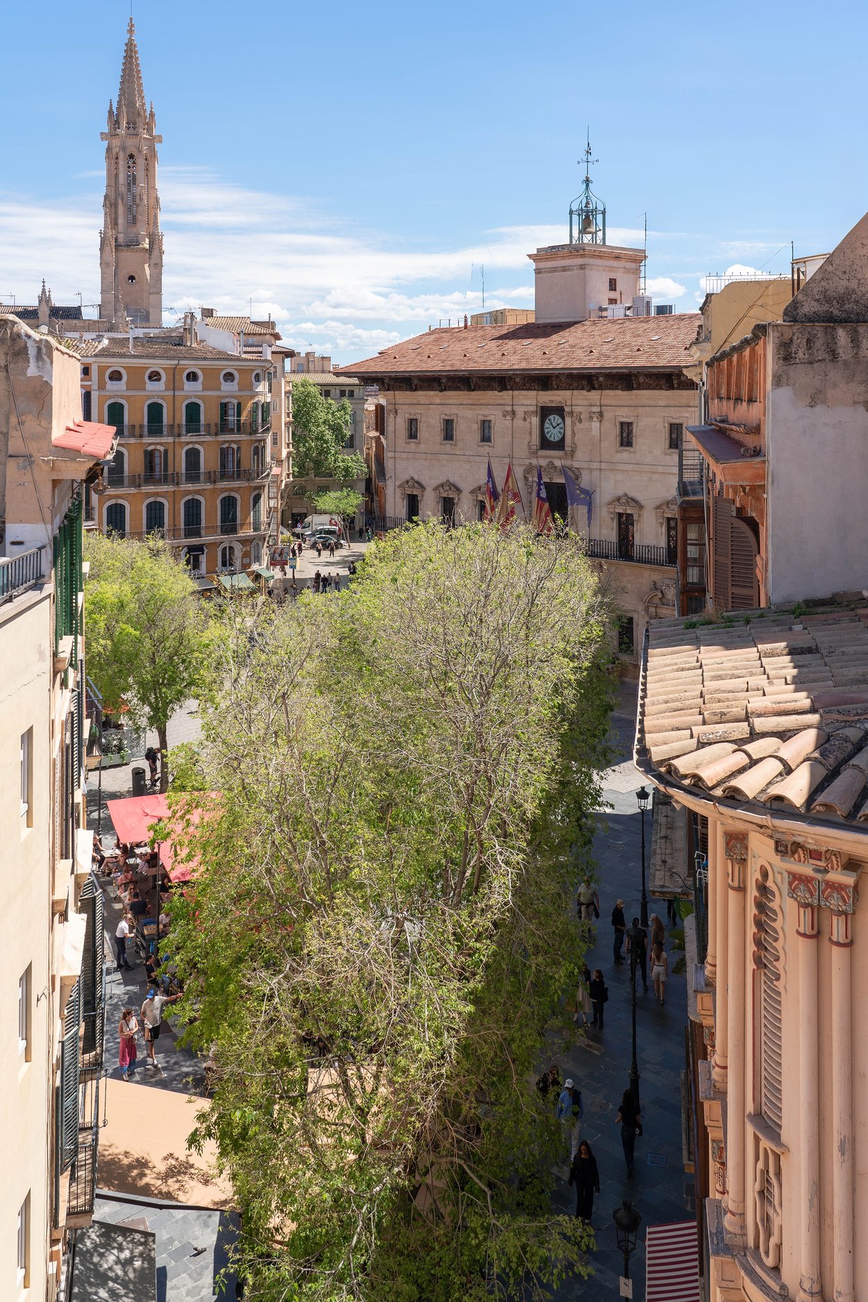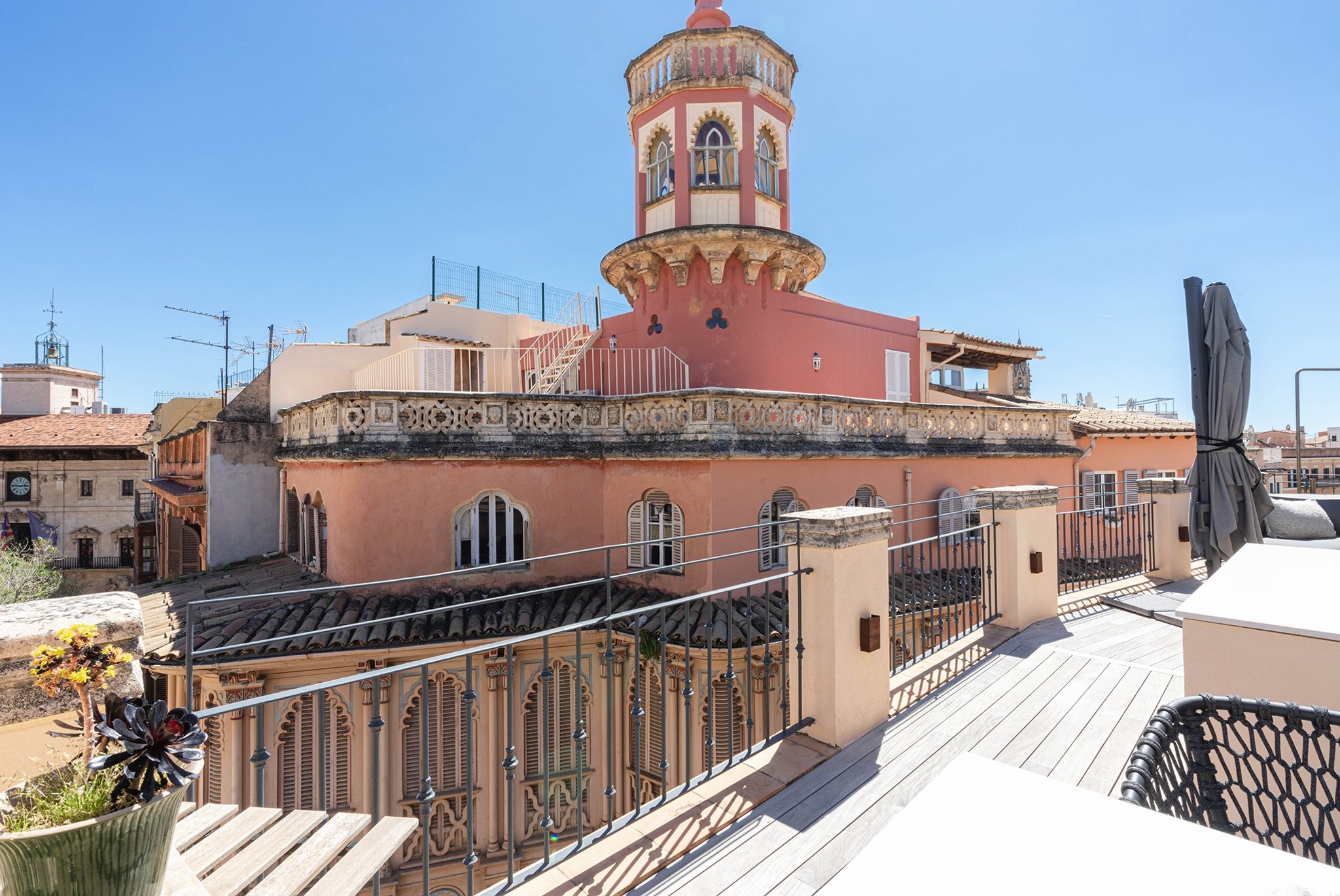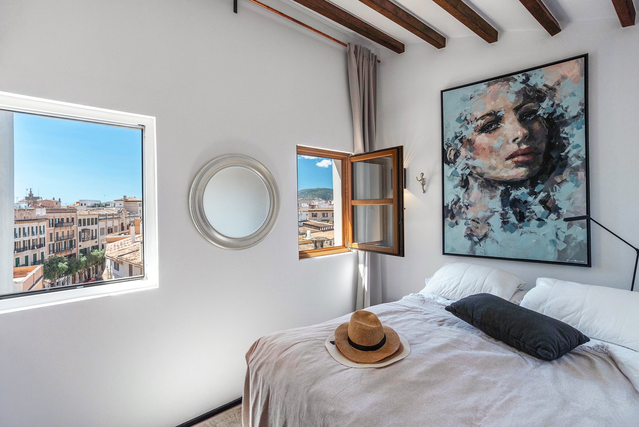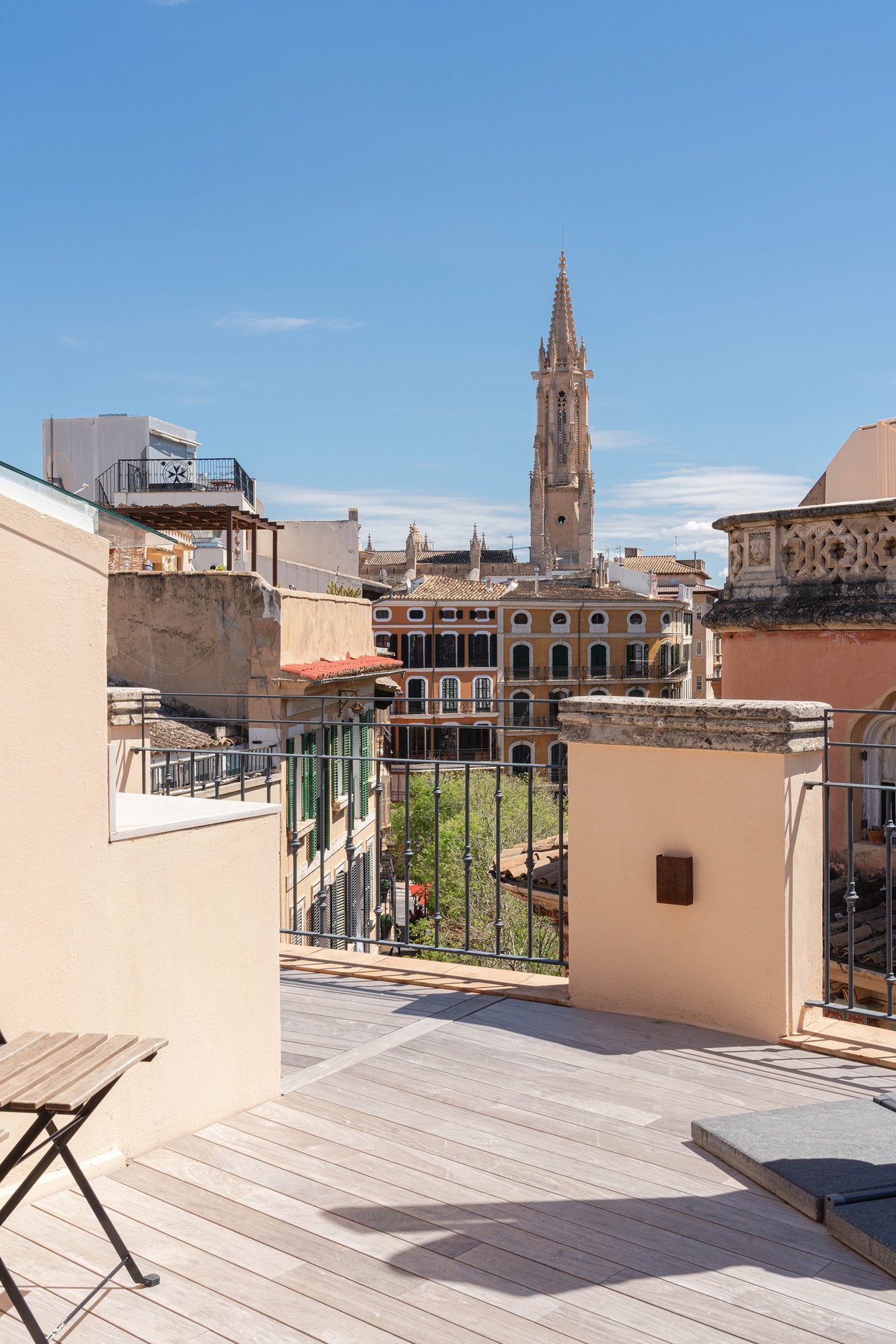 Takvåningen sträcker sig över hela det översta planet på en byggnad med fem våningar utan hiss. Planlösningen är alldeles utmärkt och både vardagsrummet, matrummet och köket vetter ut mot den stora terrassen som har sol hela dagen. De båda sovrummen har plats för dubbelsäng och har båda vacker utsikt över staden. Mitt emellan sovrummen ligger badrummet, även det med fönster med utsikt över Palmas takåsar.