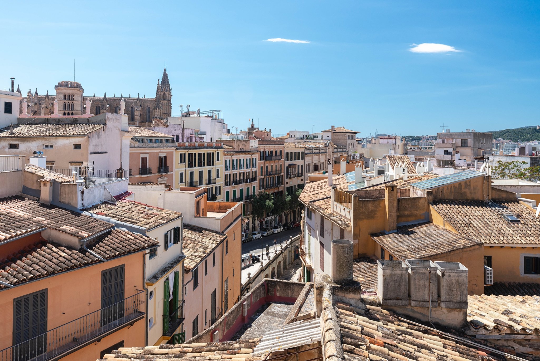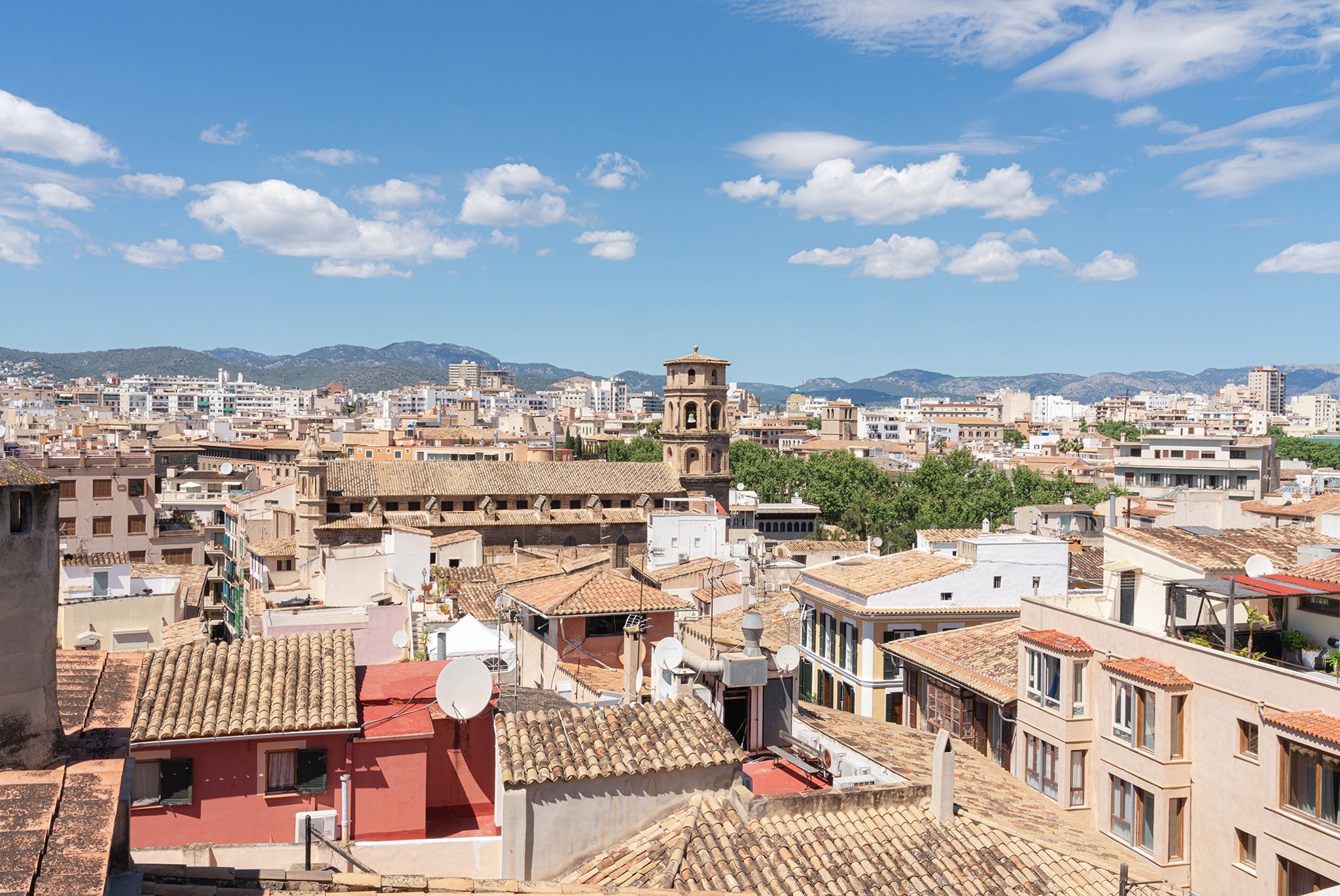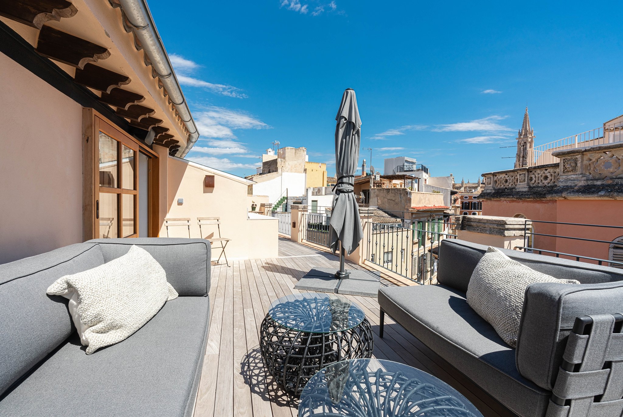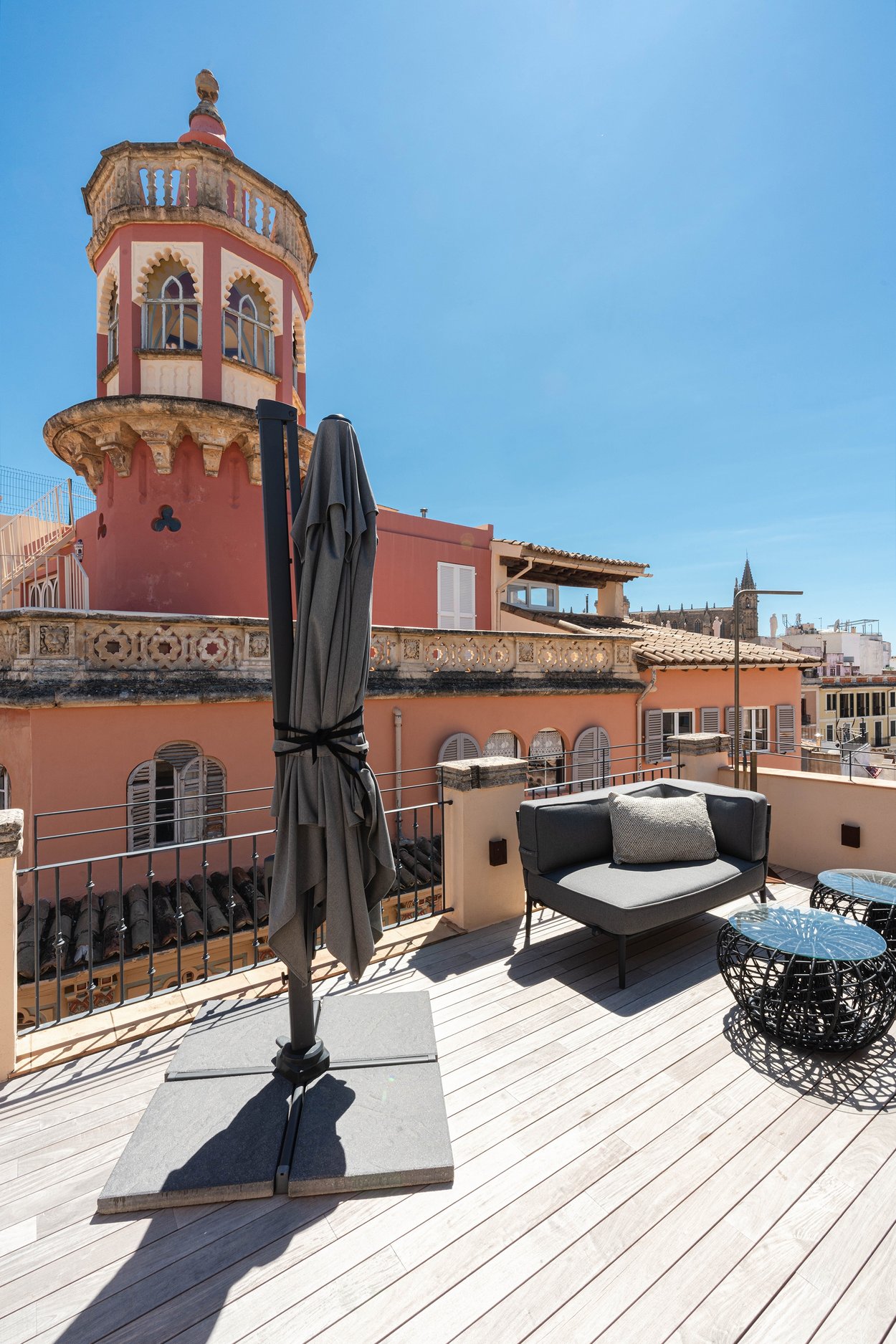 Takvåningen sträcker sig över hela det översta planet på en byggnad med fem våningar utan hiss. Planlösningen är alldeles utmärkt och både vardagsrummet, matrummet och köket vetter ut mot den stora terrassen som har sol hela dagen. De båda sovrummen har plats för dubbelsäng och har båda vacker utsikt över staden. Mitt emellan sovrummen ligger badrummet, även det med fönster med utsikt över Palmas takåsar.