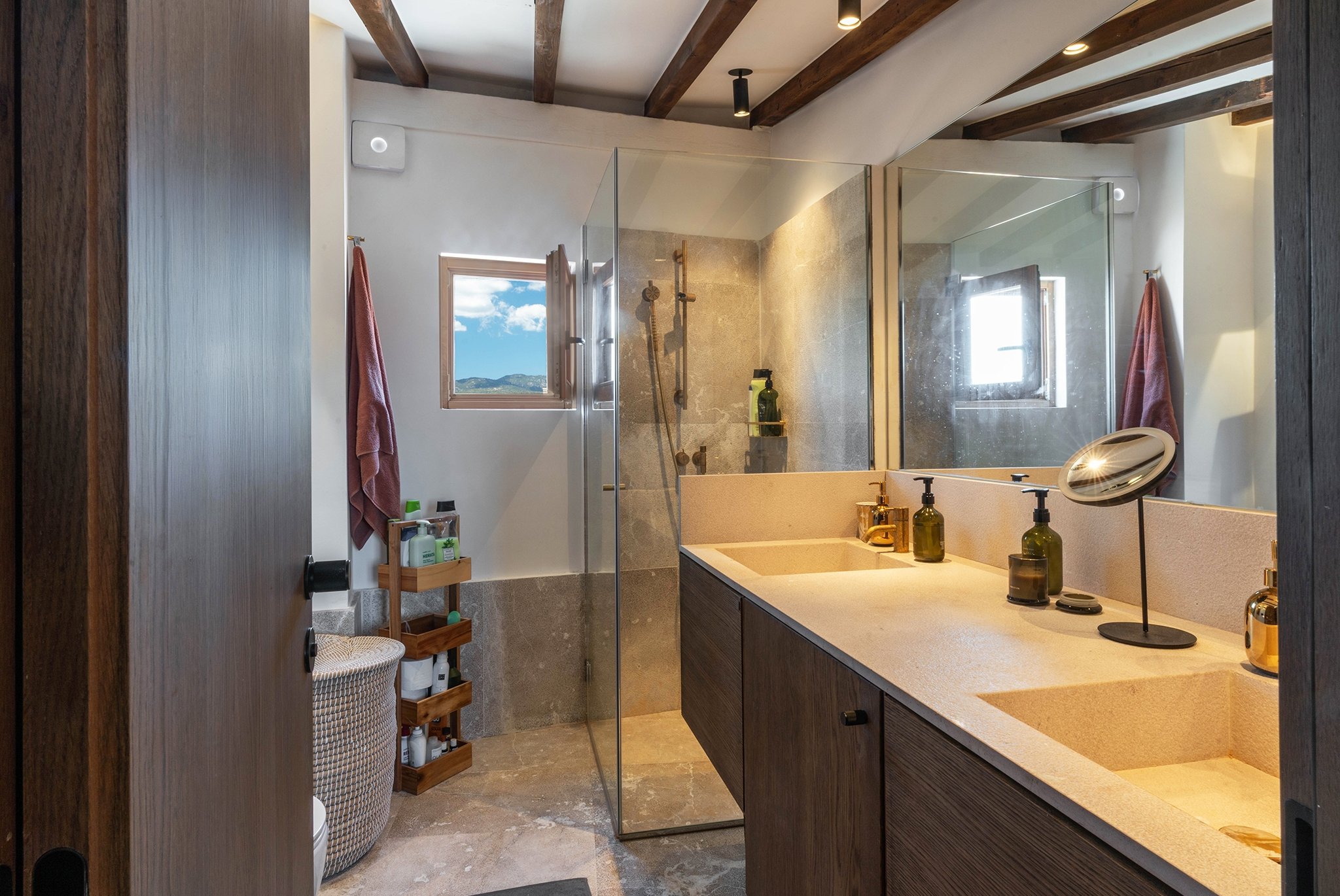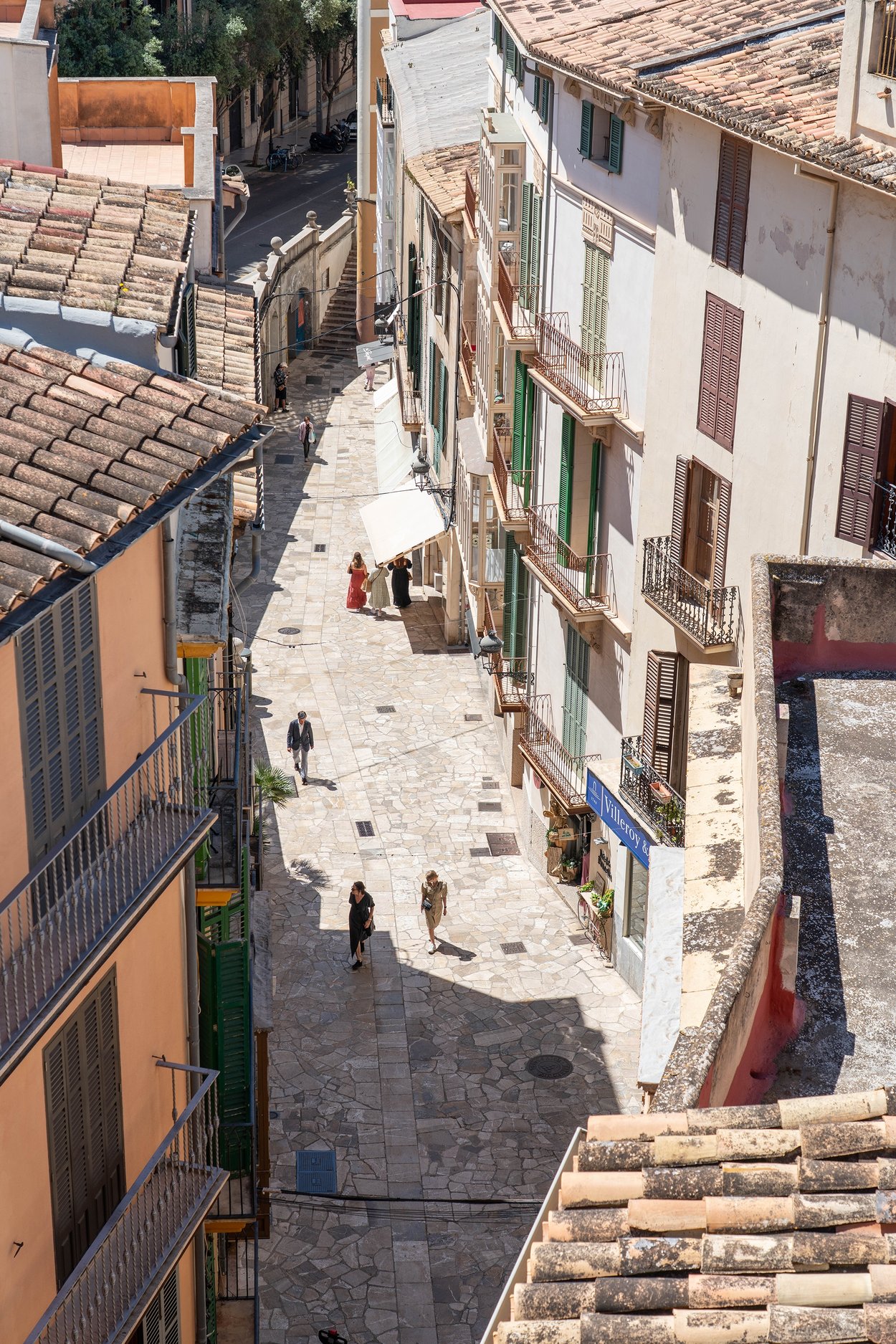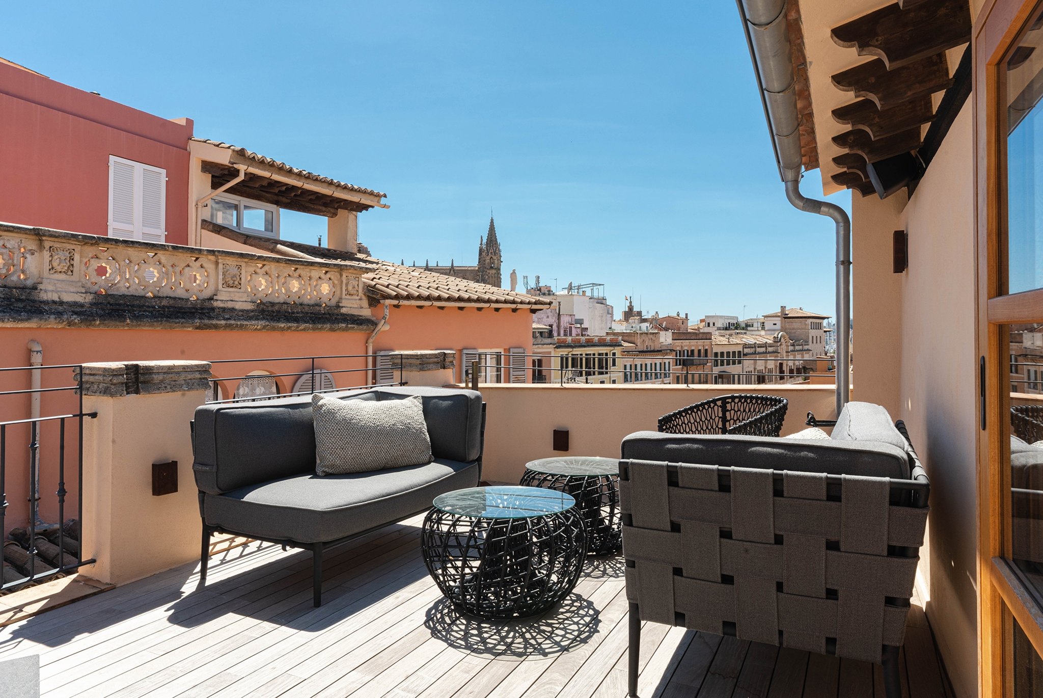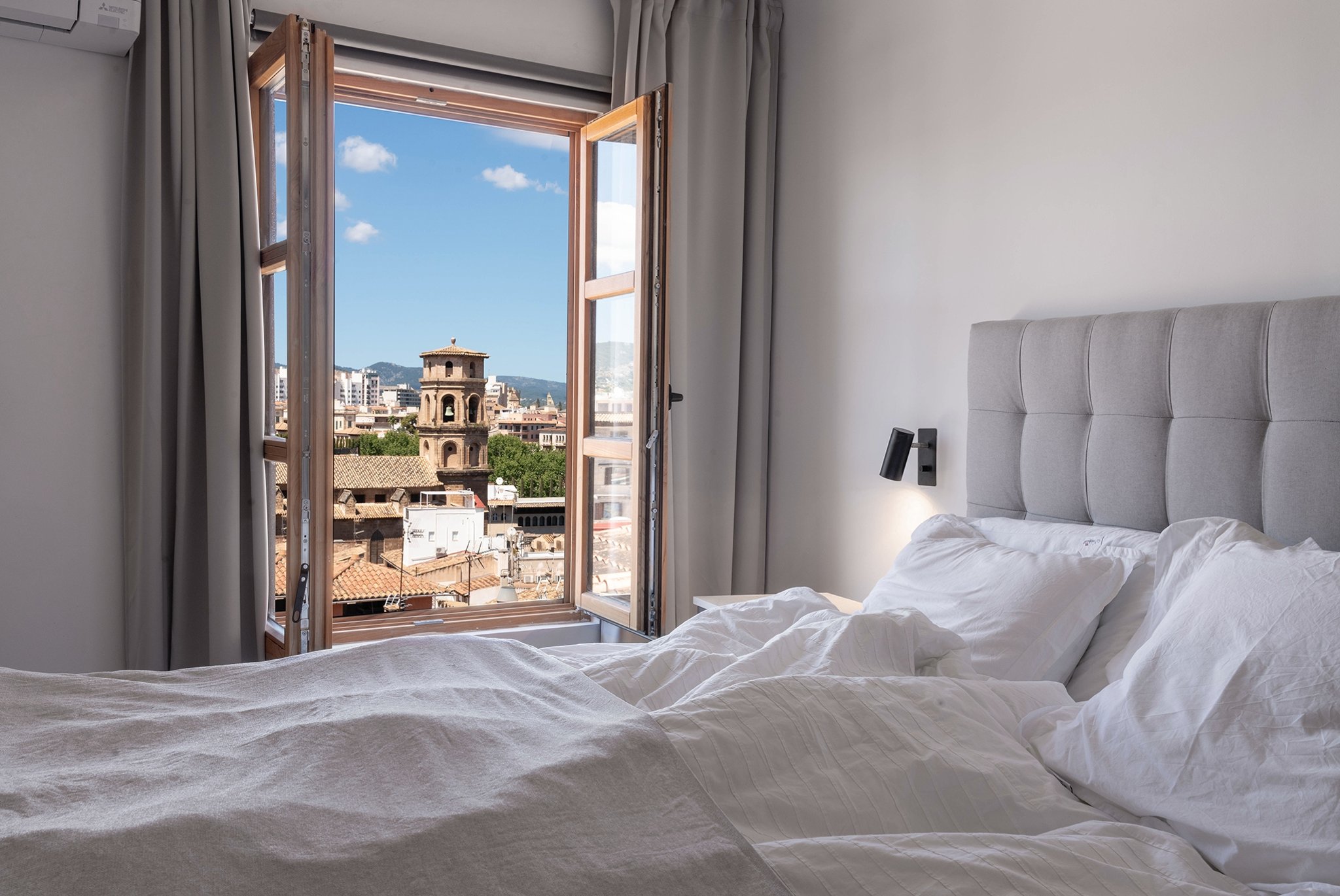 Takvåningen sträcker sig över hela det översta planet på en byggnad med fem våningar utan hiss. Planlösningen är alldeles utmärkt och både vardagsrummet, matrummet och köket vetter ut mot den stora terrassen som har sol hela dagen. De båda sovrummen har plats för dubbelsäng och har båda vacker utsikt över staden. Mitt emellan sovrummen ligger badrummet, även det med fönster med utsikt över Palmas takåsar.