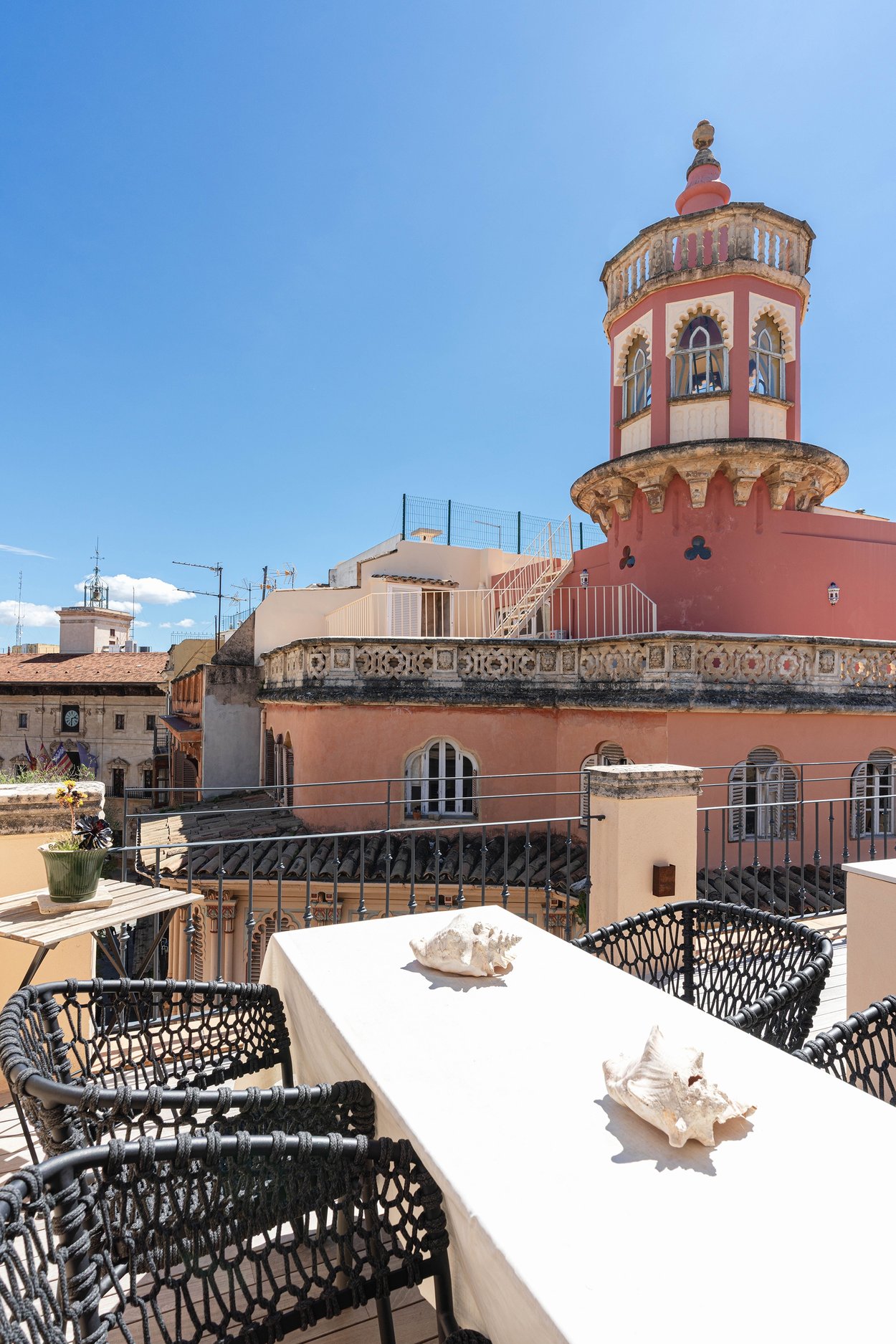 Den stora terrassen på över trettio kvadratmetrar är bostadens höjdpunkt och har utsikt över historiska byggnader, katedralen, bergen och lyxbåtarnas mastar i hamnen. Från bostaden skymtar du även havet mellan takåsarna.