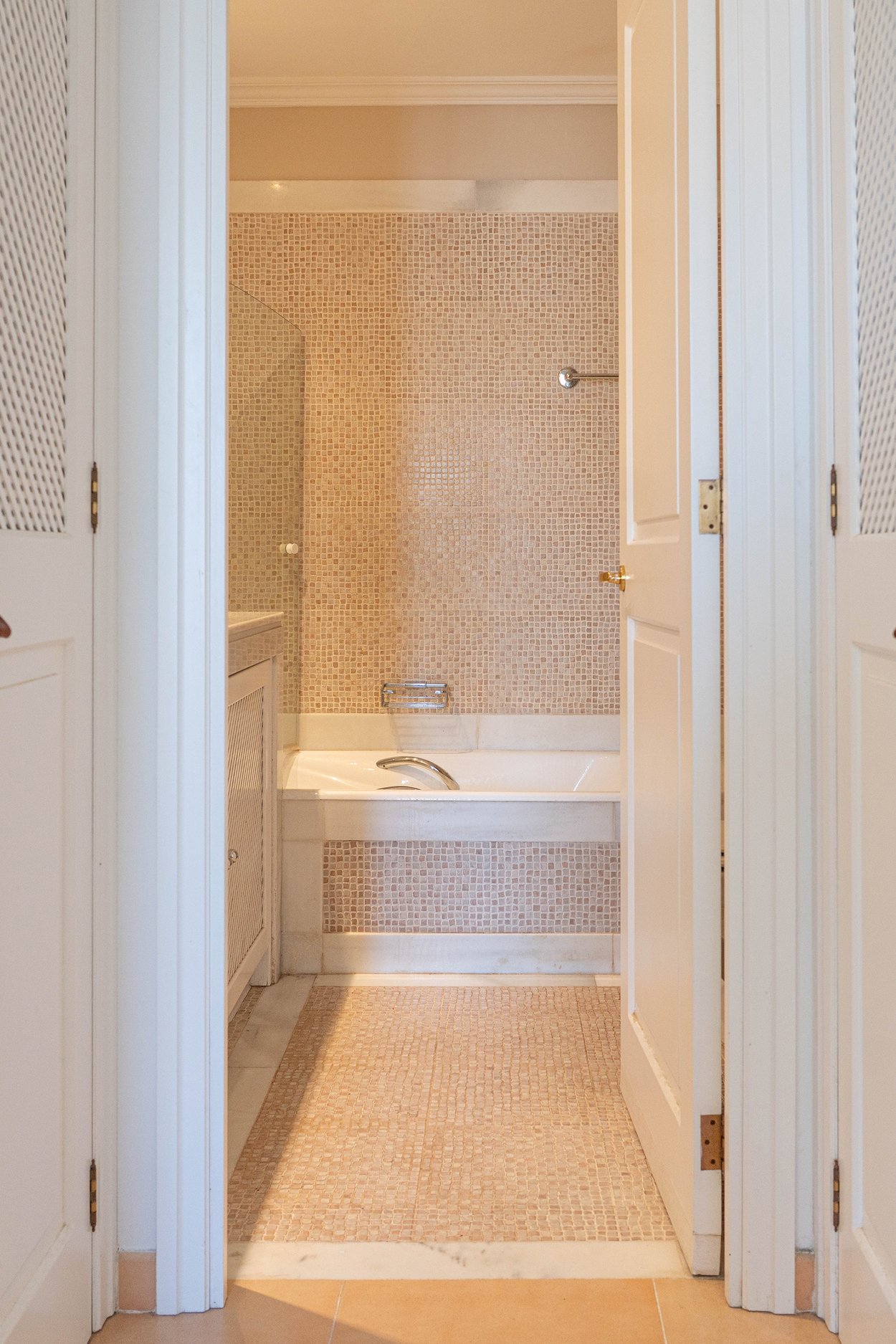 Från ett av sovrummen och vardagsrummet har du tillgång till en terrass på 15 m². Från vardagsrummet leder en trappa upp till den lilla privata takterrassen på hela 260 m². Bostaden är genomgående ljus med smakfulla materialval, detaljer som spröjsade balkongdörrar och ljusa ytskikt, vilket skapar en inbjudande och stilren atmosfär. Till takvåningen hör även tillgång till ett gemensamt poolområde och ett gym.